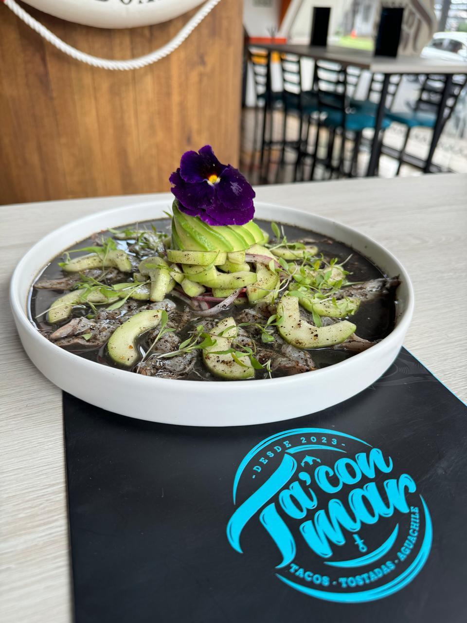 200 g. Aguachile negro de camarón con habanero, pepino, cebolla morada y aguacate.