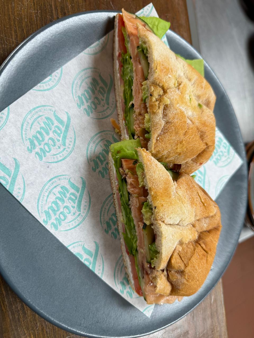 Salmon ahumado, Mayonesa, queso crema, aguacate, jitomate, cebolla, pepino, arúgula y Reducción de Jamaica.