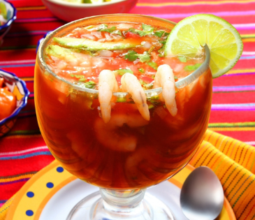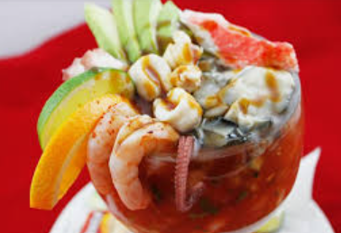Camarón, pulpo, cebolla, pepino chile (opcional jitomate y aguacate.