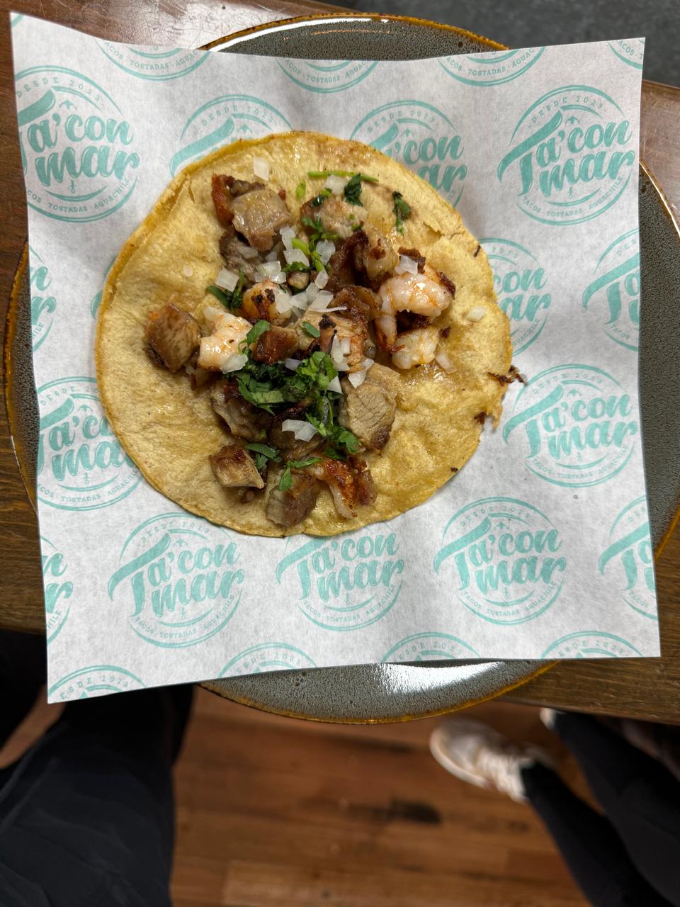 1 Pza. Suadero con camarón salteado servido en tortilla de maíz.