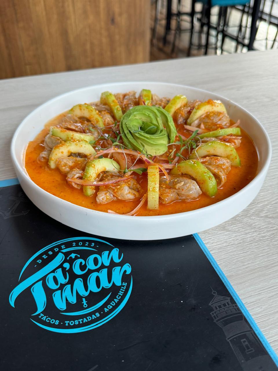 200 g. Aguachile rojo de camarón con chiltepín, pepino, cebolla morada y aguacate.
