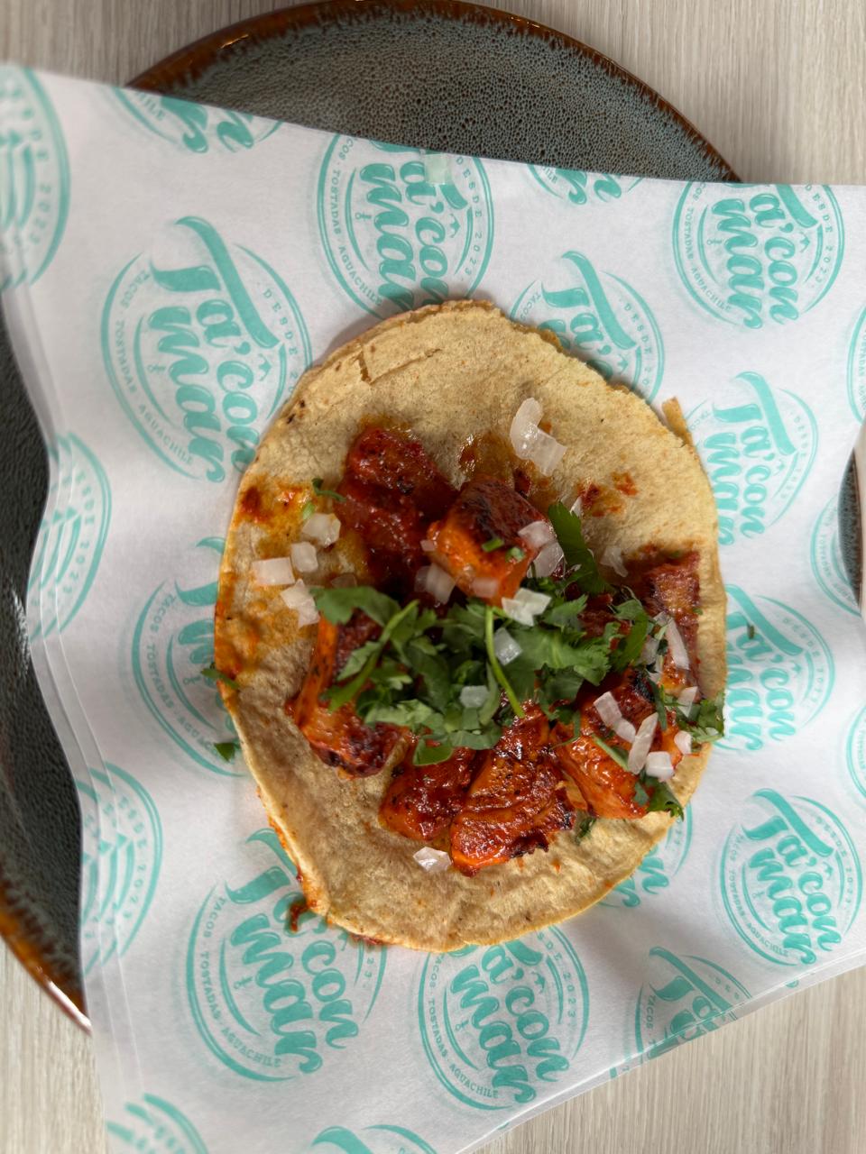 1 Pza. Pescado marinado al pastor y piña servido en tortilla de maíz.