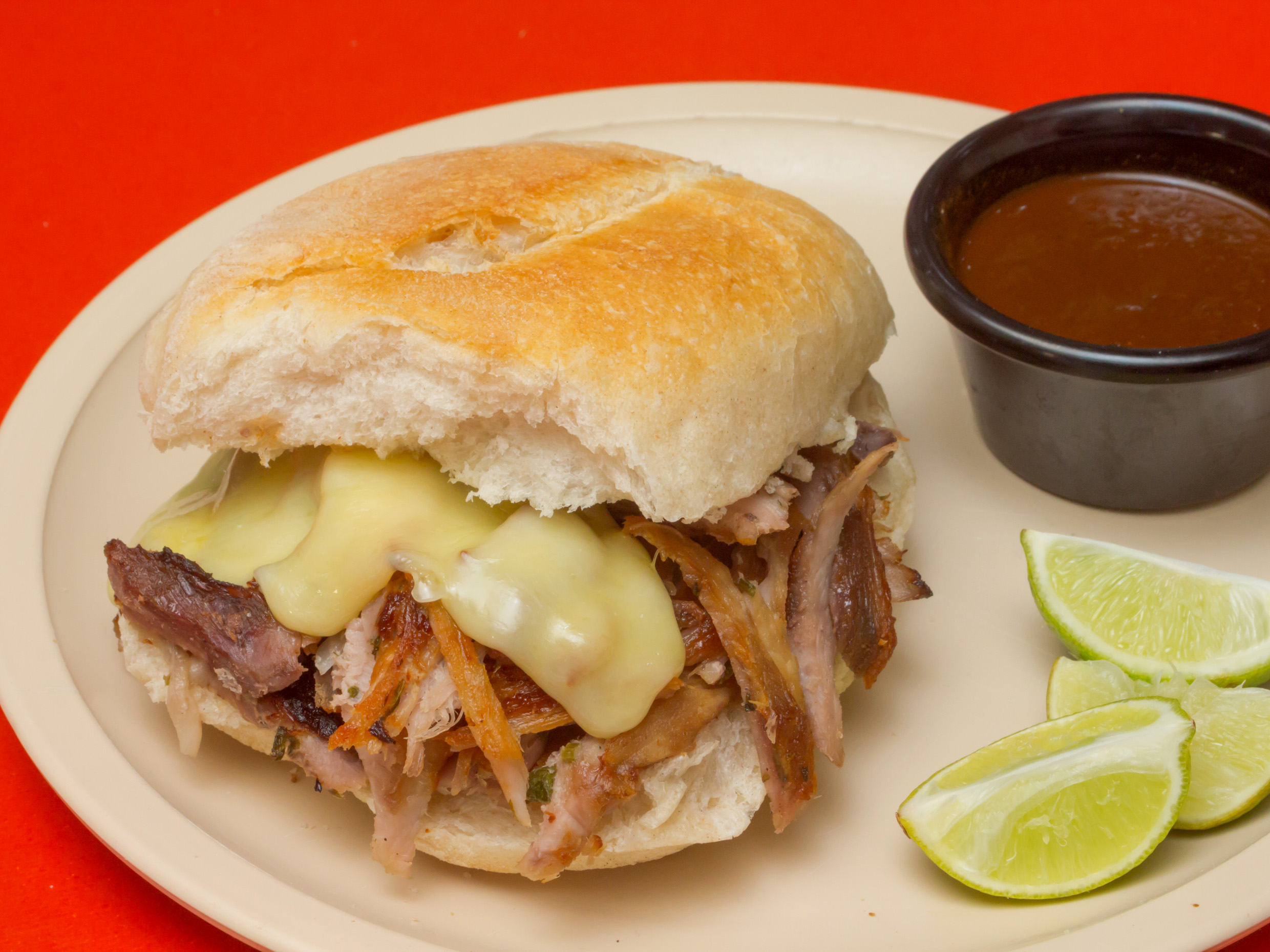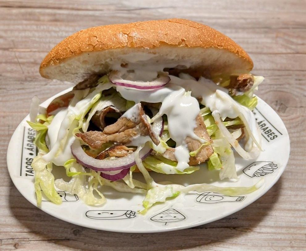 La original carne árabe estilo Puebla en torta de agua (única en CDMX) de tamaño mediano, servida con salsa de chipotle y limones aparte.