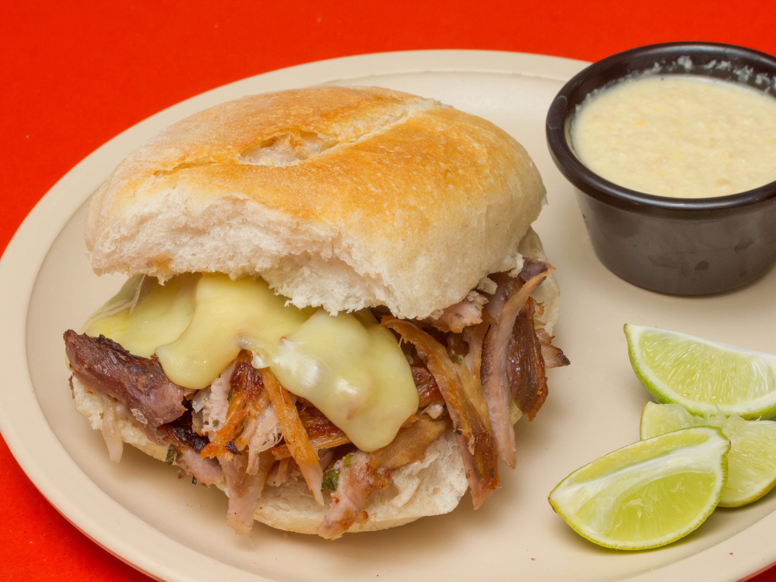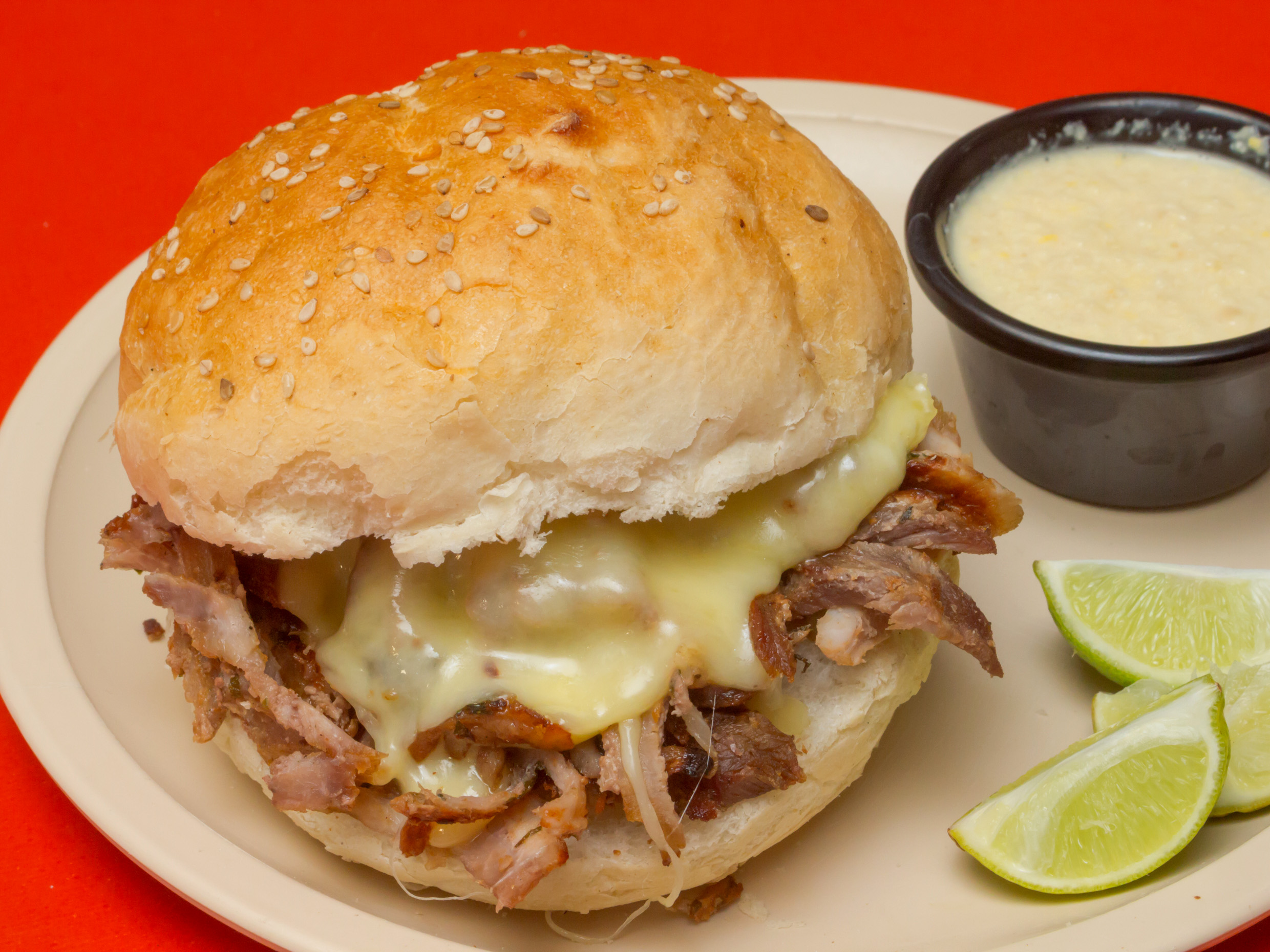Delicioso pan de cemita poblana de tamaño mediano acompañada de carne árabe, queso gouda y nuestro aderezo de gine (garbanza).