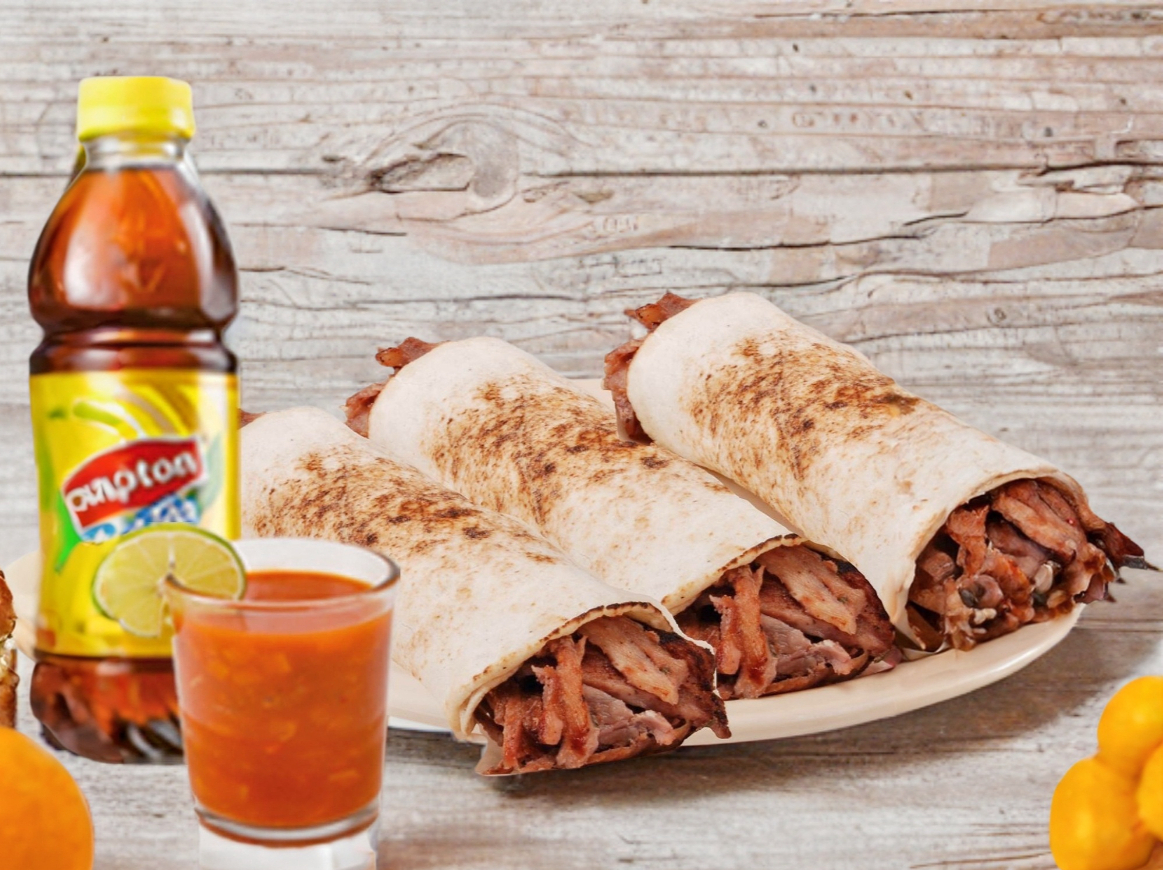 Incluye 9 tacos árabes, 3 caldos de camarón, 1 orden de cebollitas y 3 refrescos o agua.