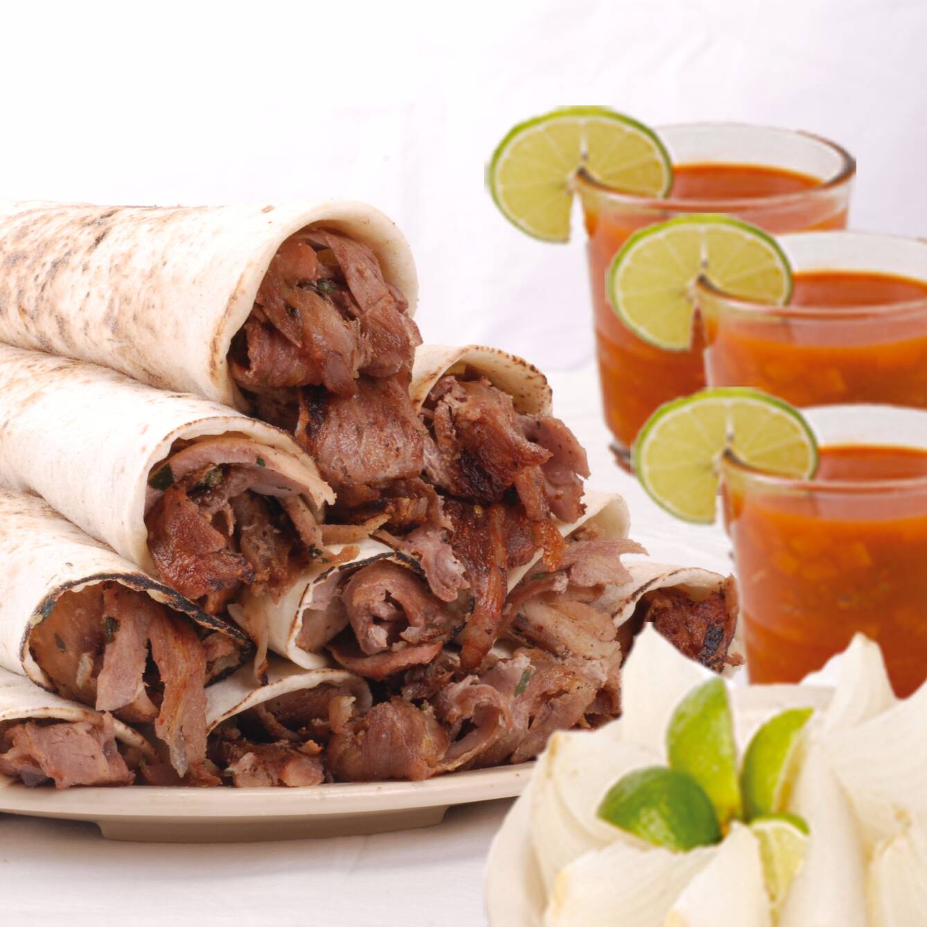1 kilo de la tradicional Carne árabe, 10 pz de pan árabe, 10 pz de tortillas de maíz, salsa de chipotle y limones.
