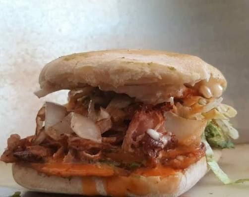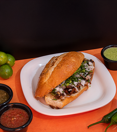 Sabrosa torta de carne al pastor en telera de tamaño tradicional.