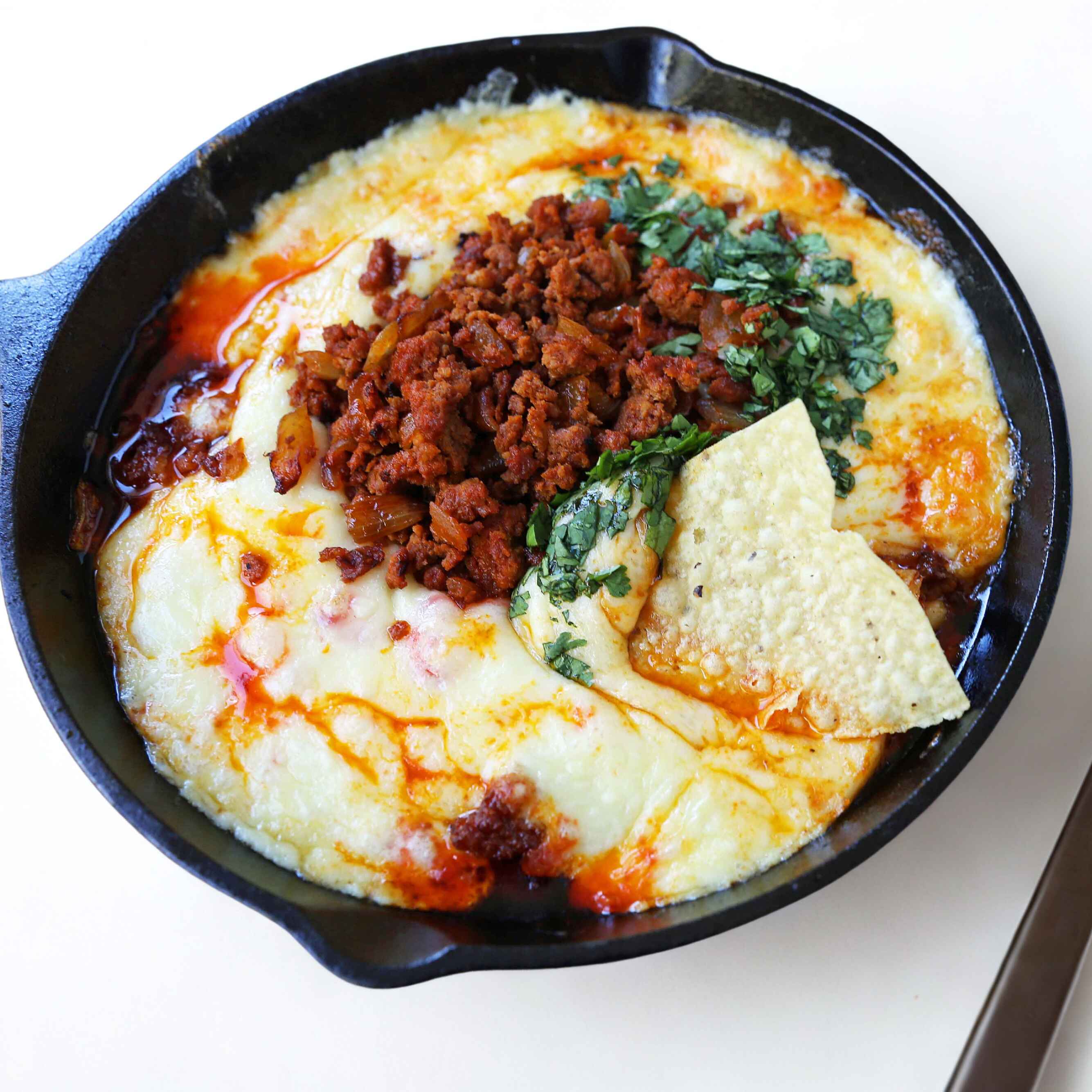 Deliciosa carne de suadero envuelta en queso servida sobre tortilla de harina de tamaño estándar.