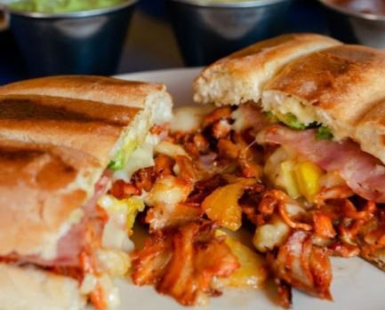 Exquisita gringa de carne al pastor, piña y queso Oaxaca en doble tortilla de harina de tamaño normal