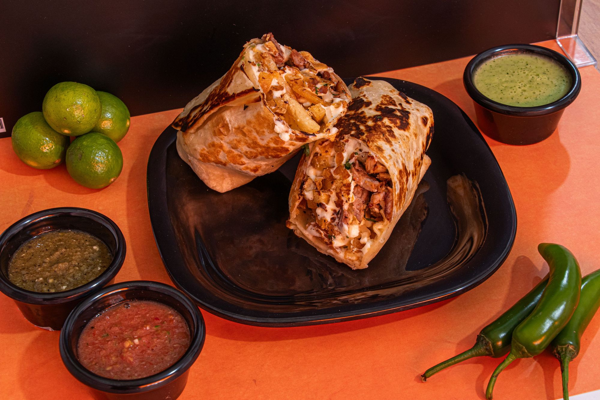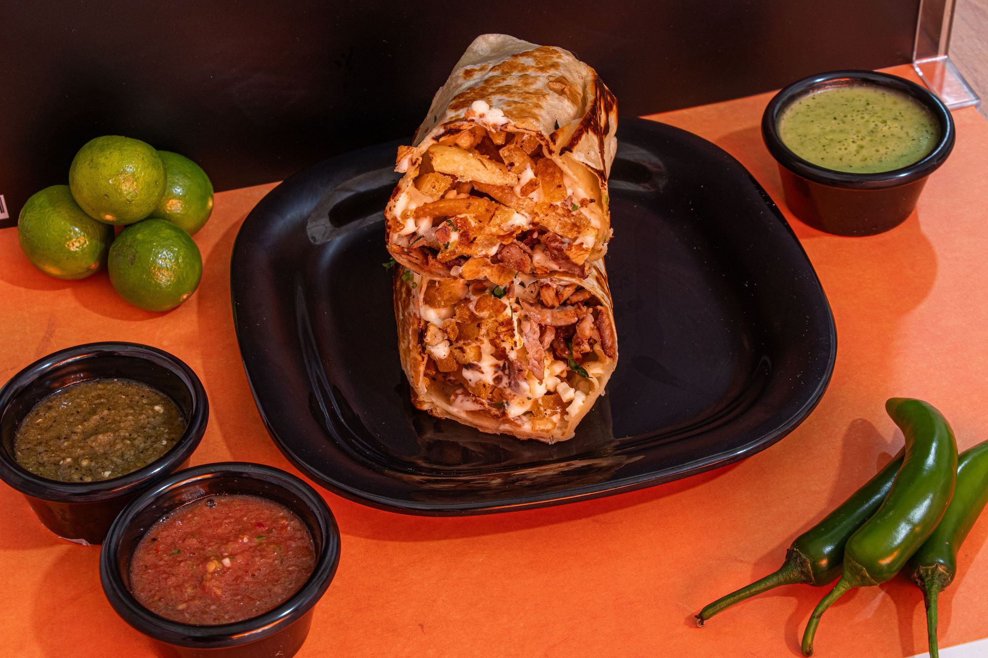 Sabroso burrito relleno de pastor, quesillo y frijoles en tortilla de harina burrera
