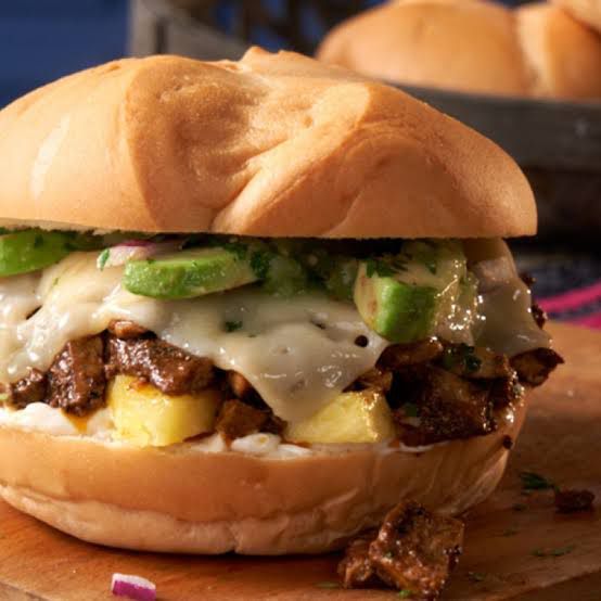 Deliciosa torta de carne al pastor con quesillo en bolillo de tamaño tradicional