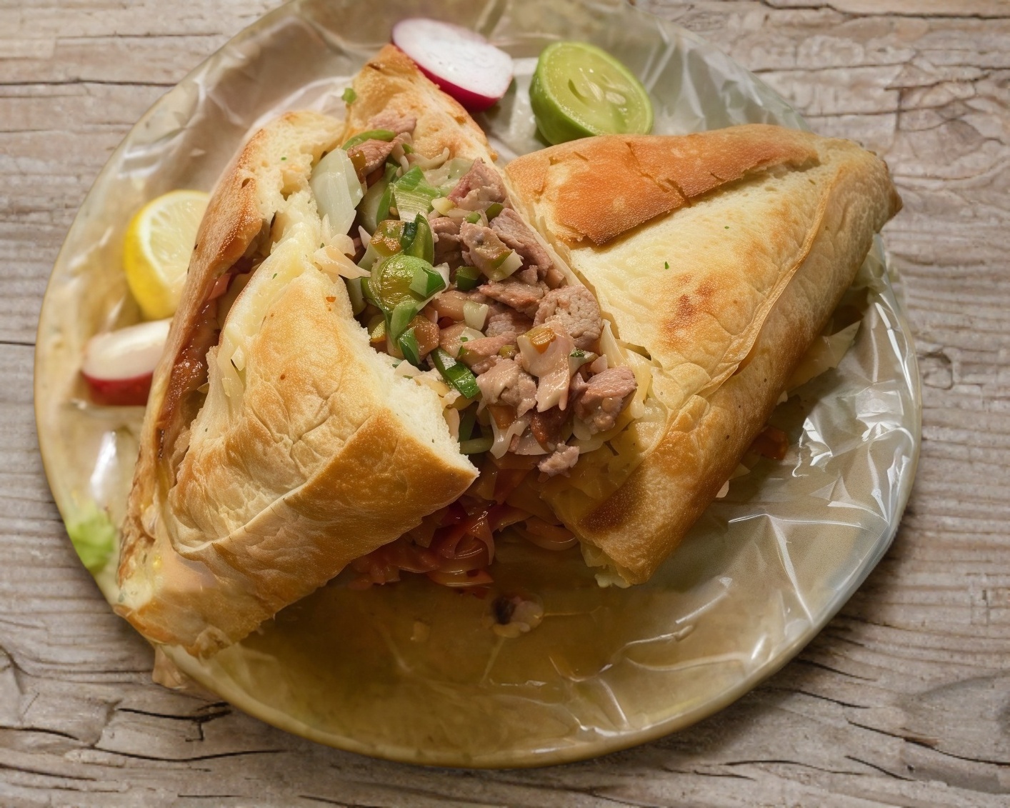Torta de birria con queso cebolla cilantro.