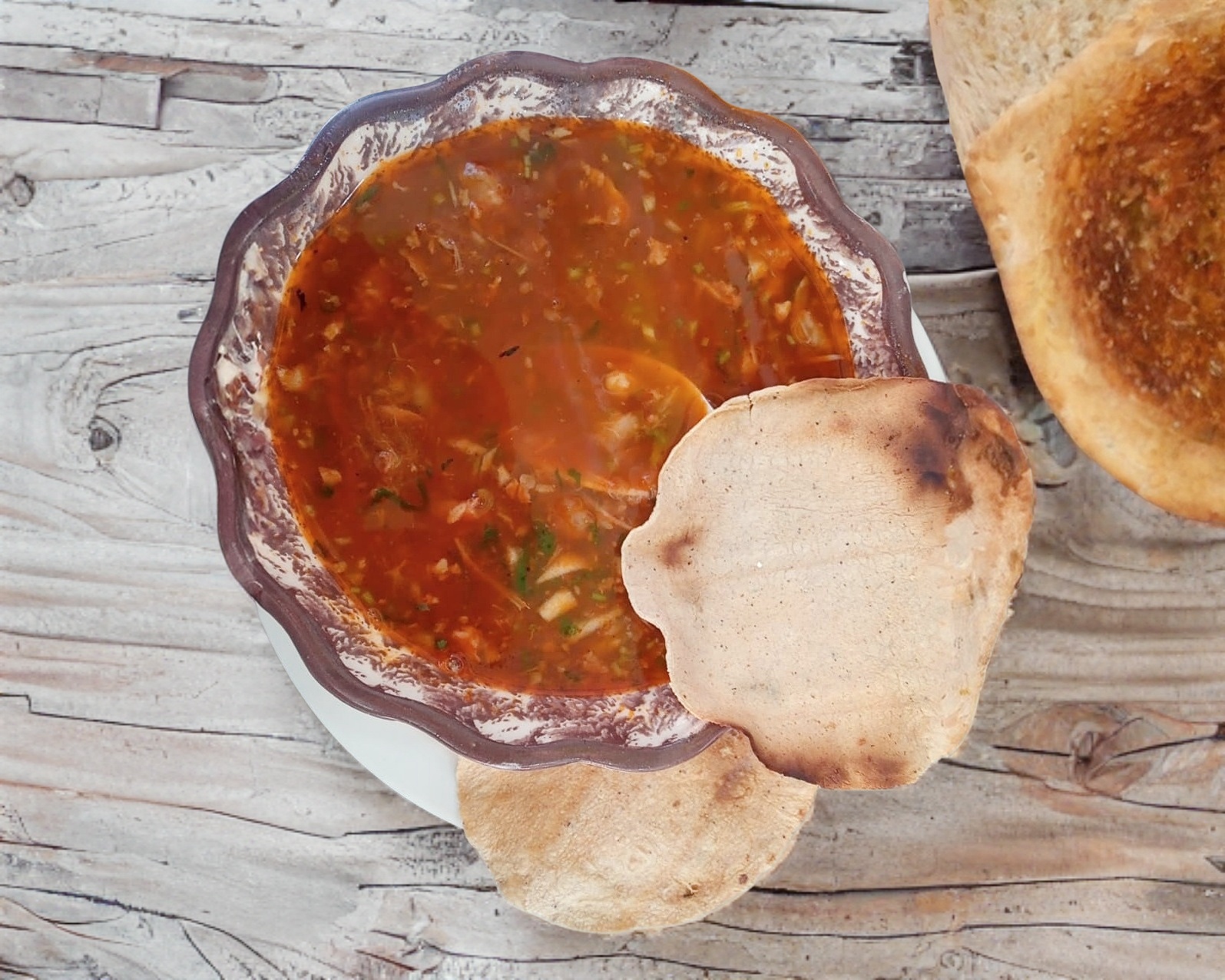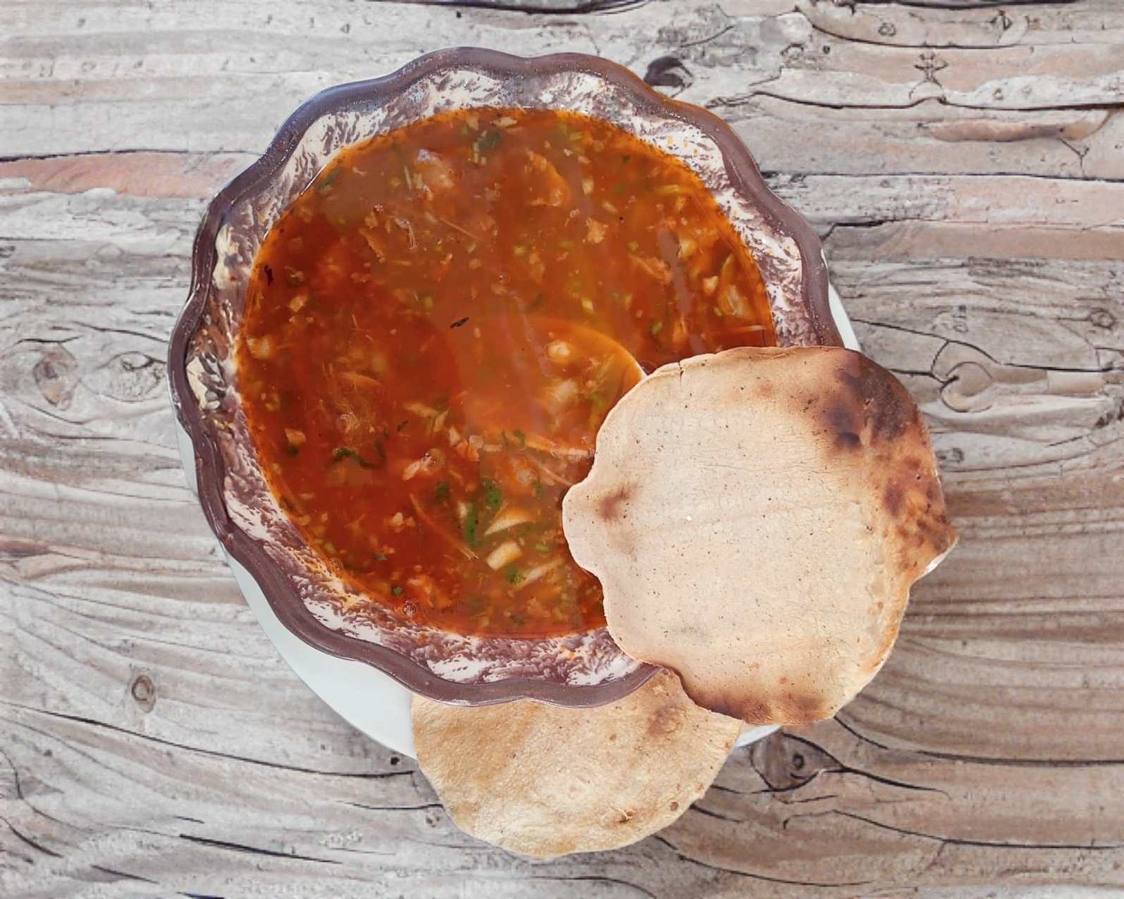 Consomé de birria, carne de birria, cebolla, cilantro y salsa.