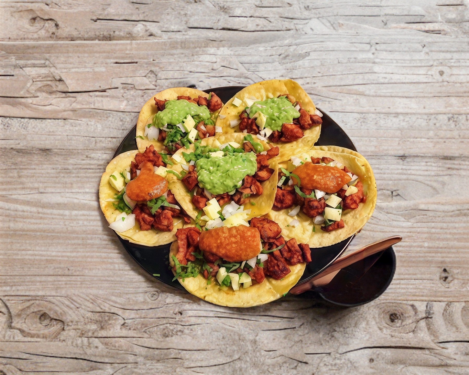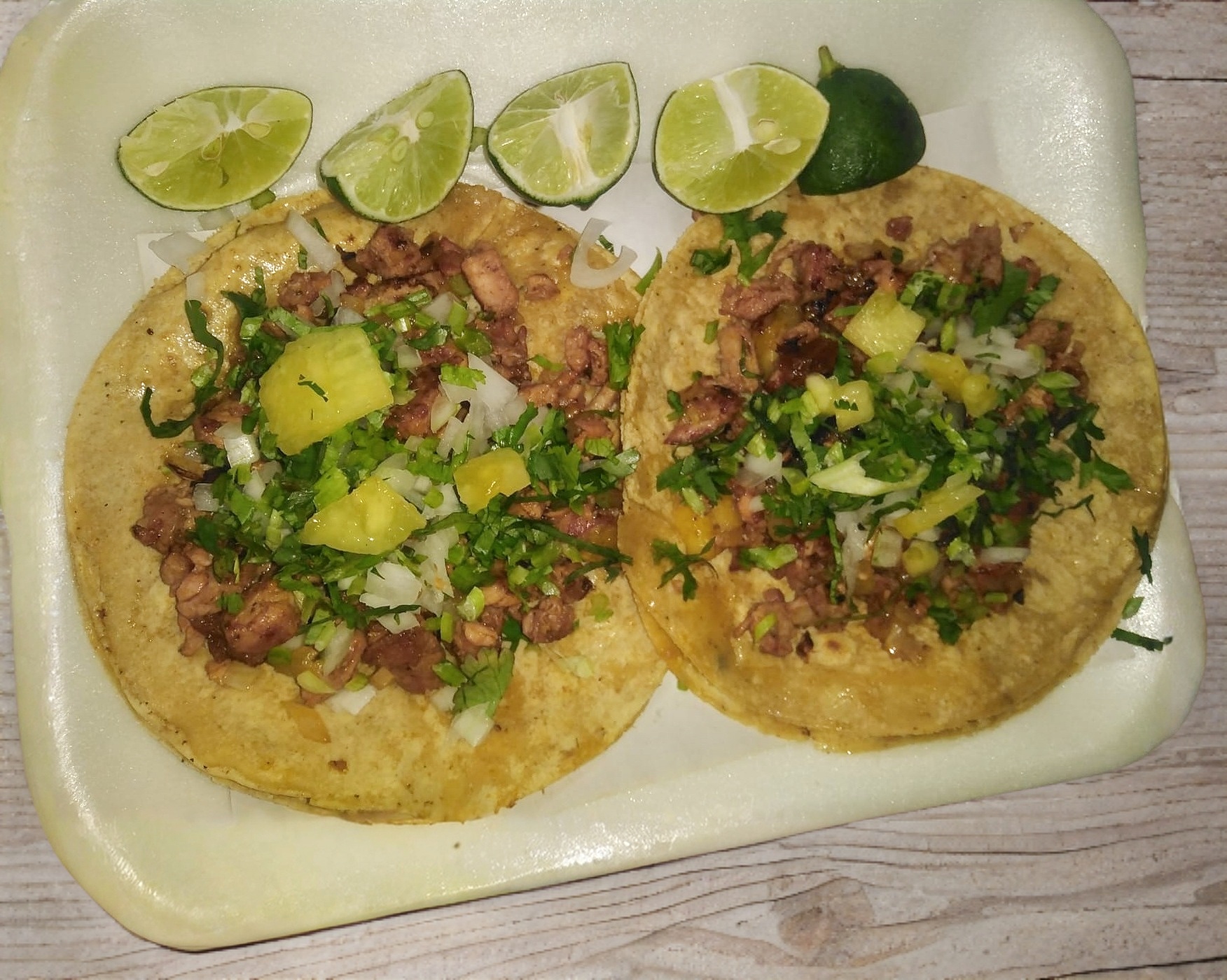 Acompañado de cebolla, cilantro, queso, bistec, piña, jamón.