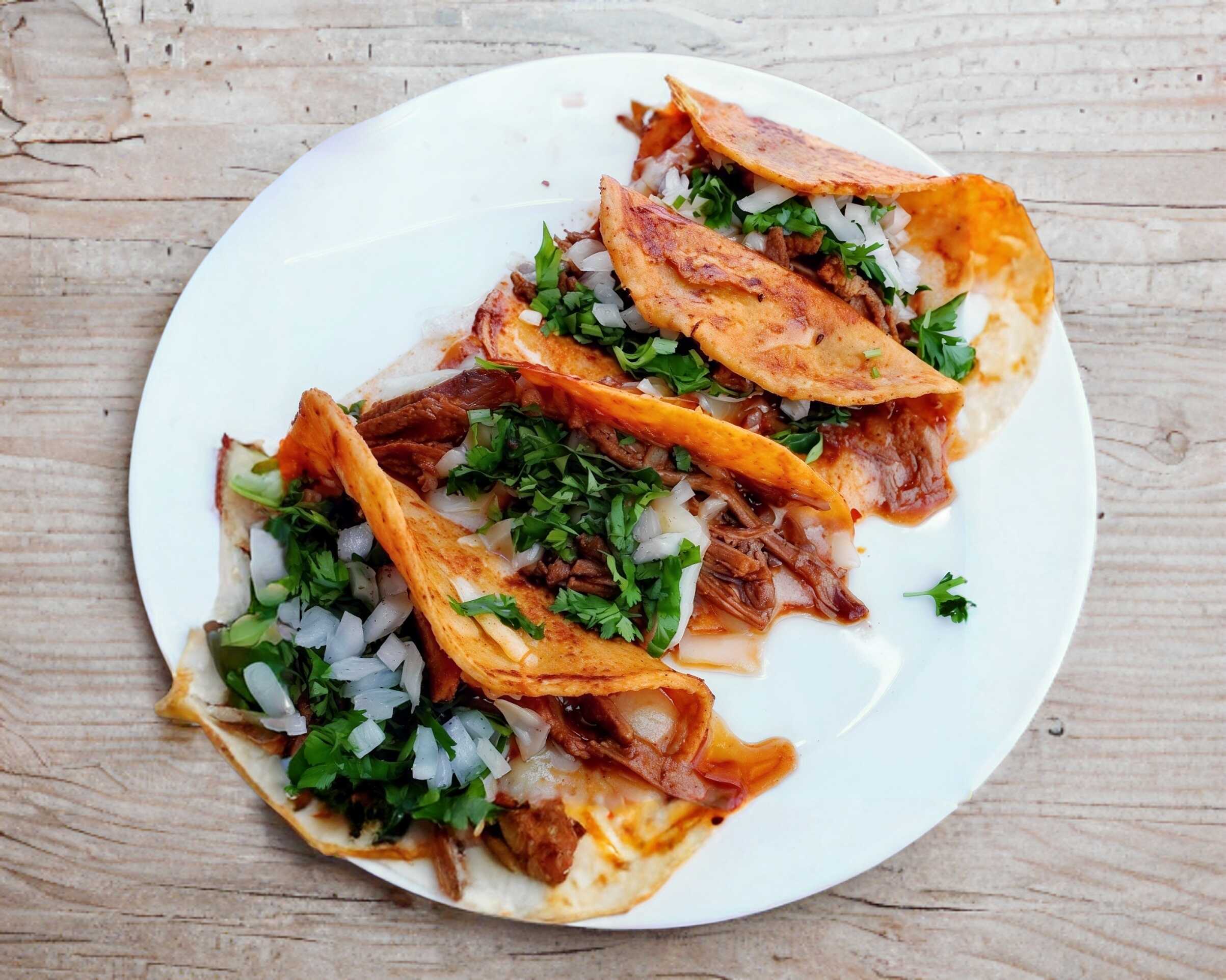 Birria con queso fundido con cebolla y cilantro.