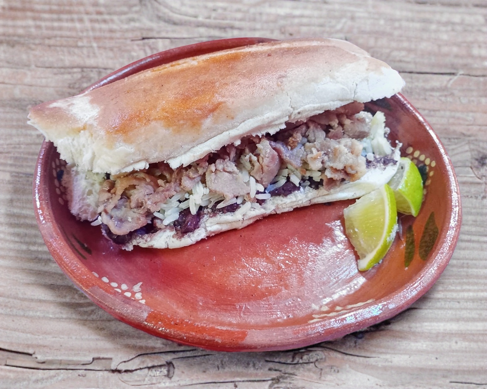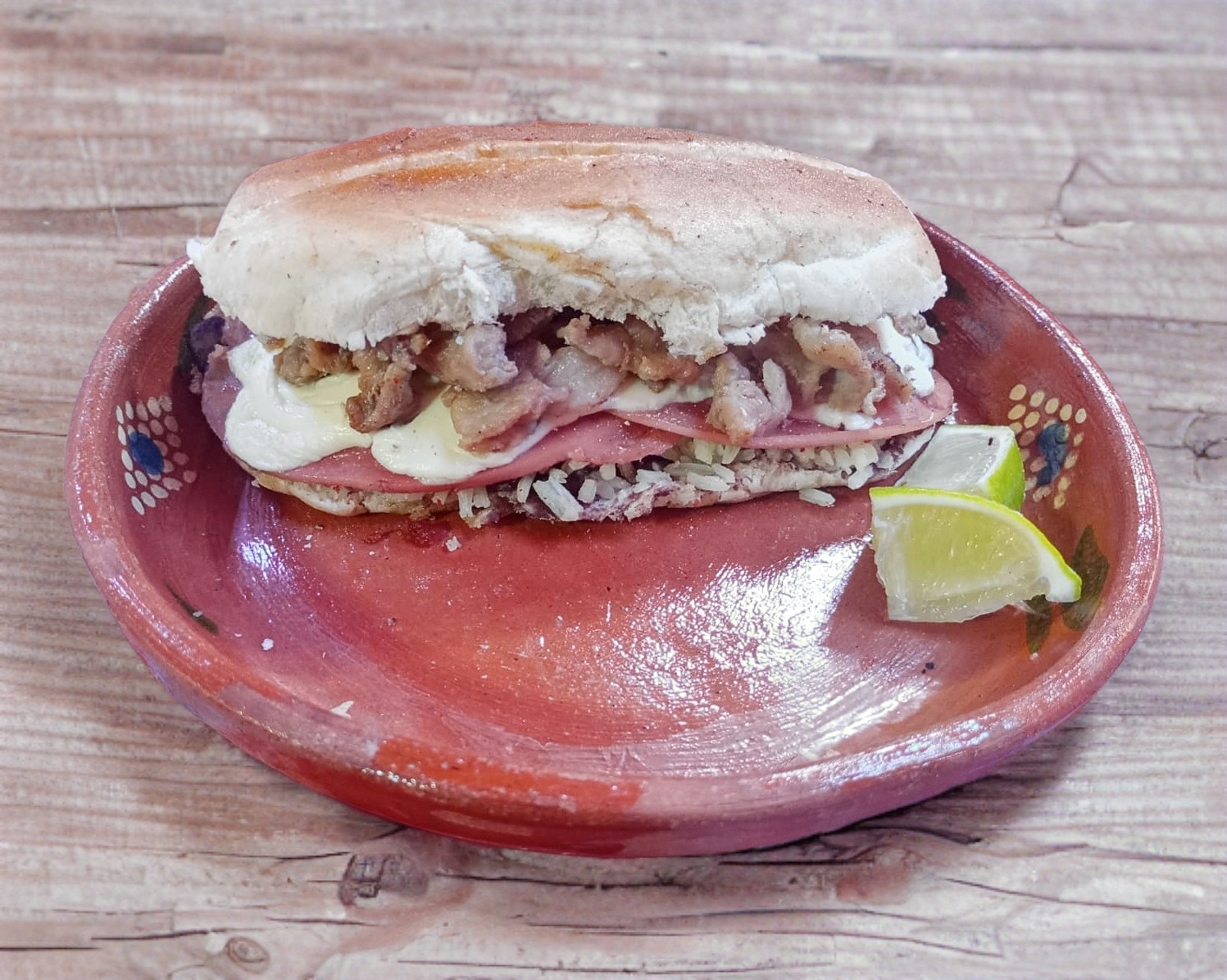 Torta de Guisado a elección con arroz, frijol, jamón y queso.