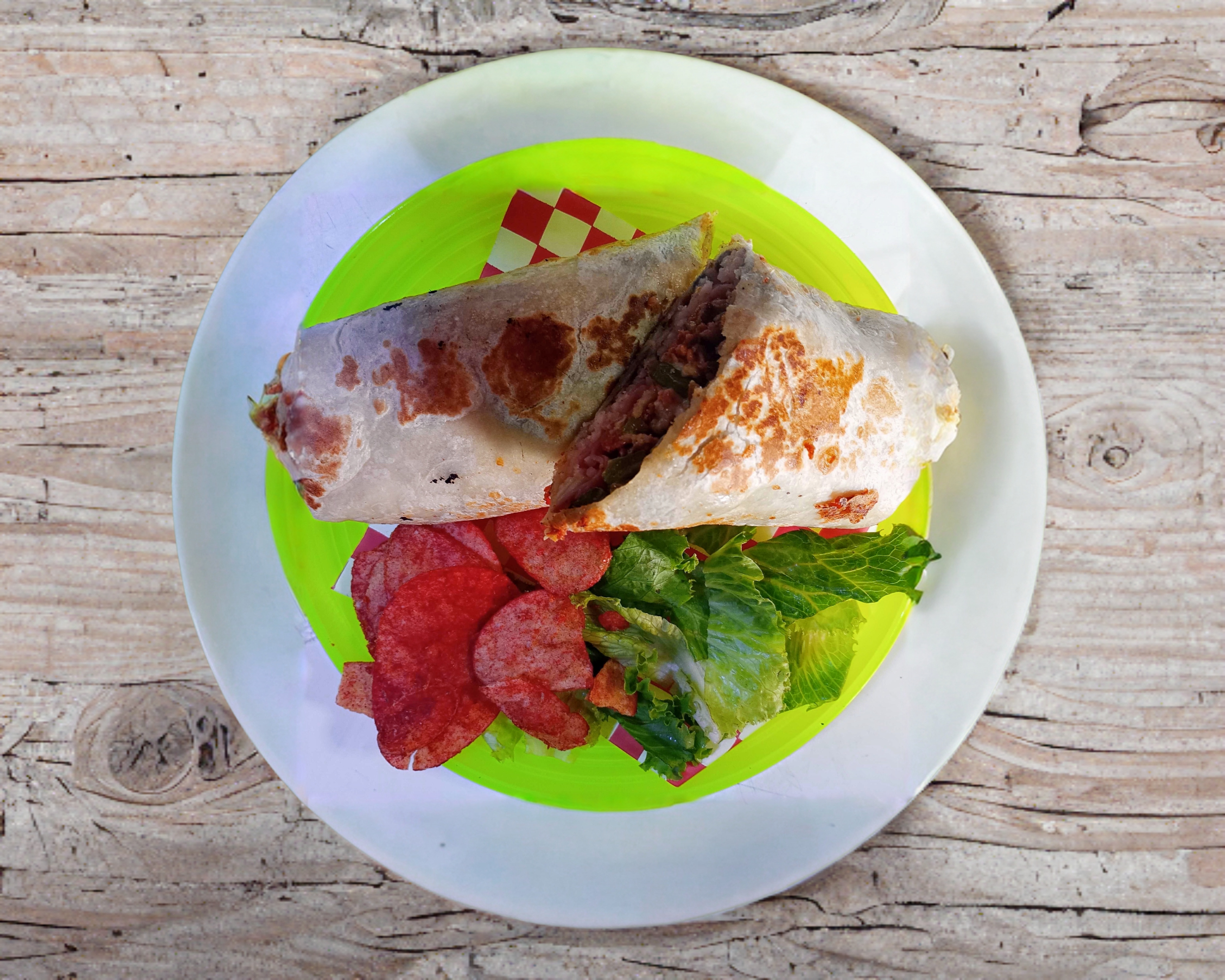 Tortilla de harina tamaño burrito relleno de arroz, frijol, jamón, queso y guisado a elección.