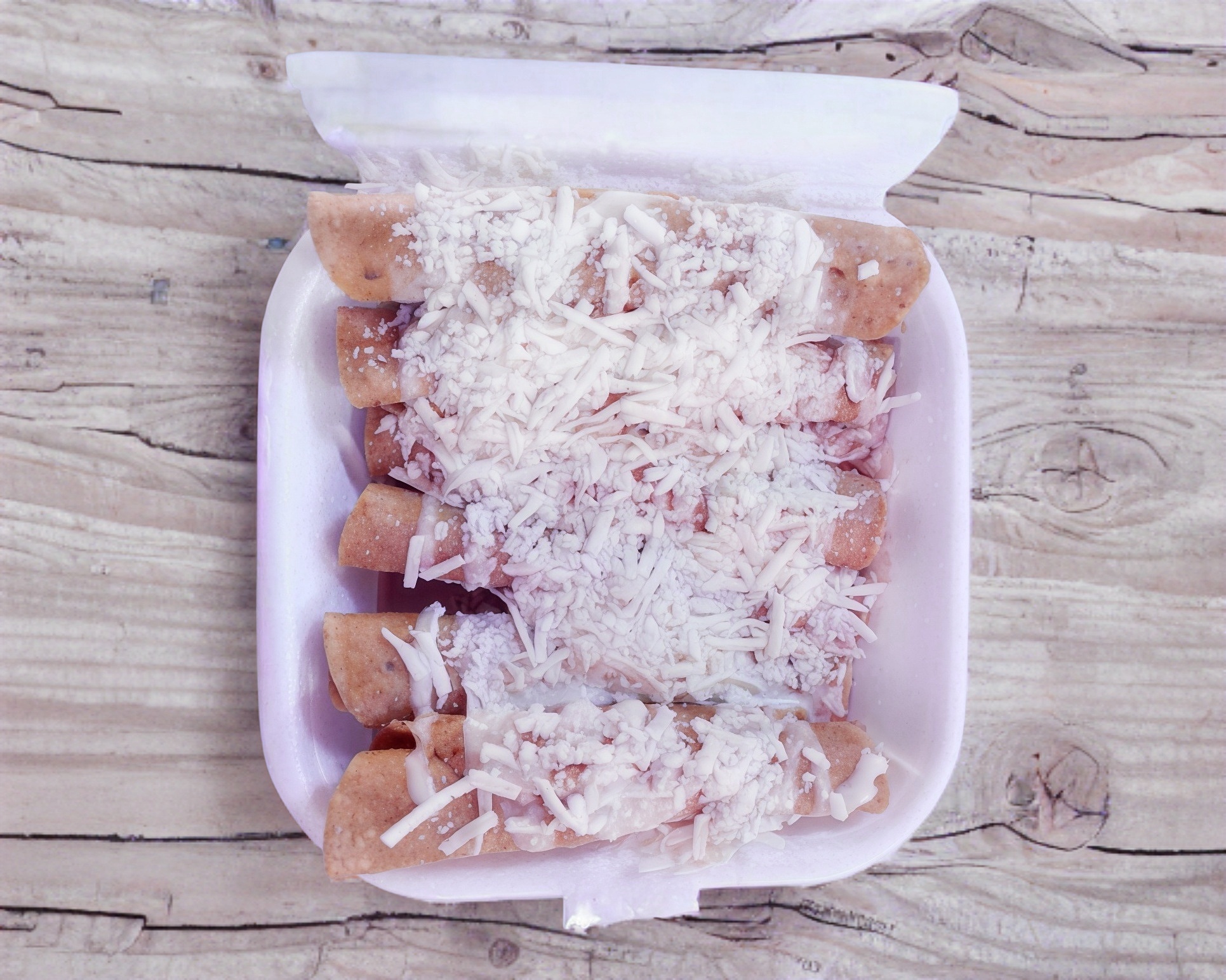Platillo individual: orden de 3 tacos dorados de queso panela, acompañados de crema y queso, con cebolla y cilantro, incluye salsa aparte.