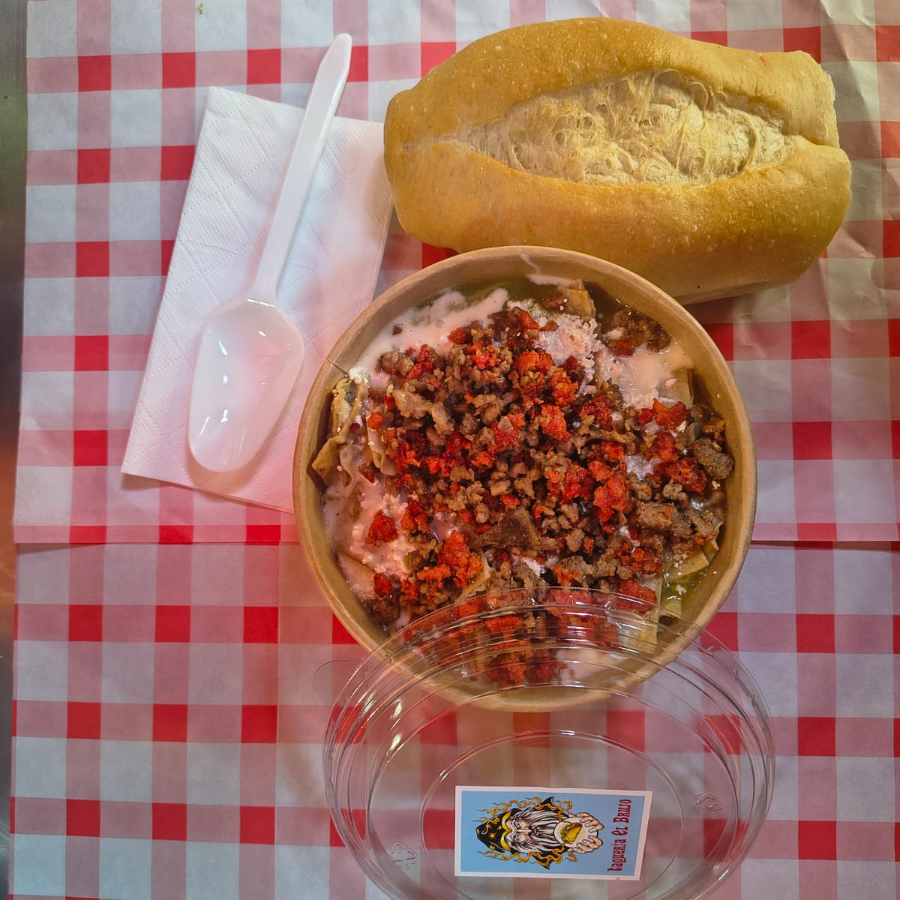Platillo personal: orden de chilaquiles servidos en domo, con 102 g de totopos, 500 ml de salsa y guisado a elección. Ingredientes ya preparados; bolillo por aparte.