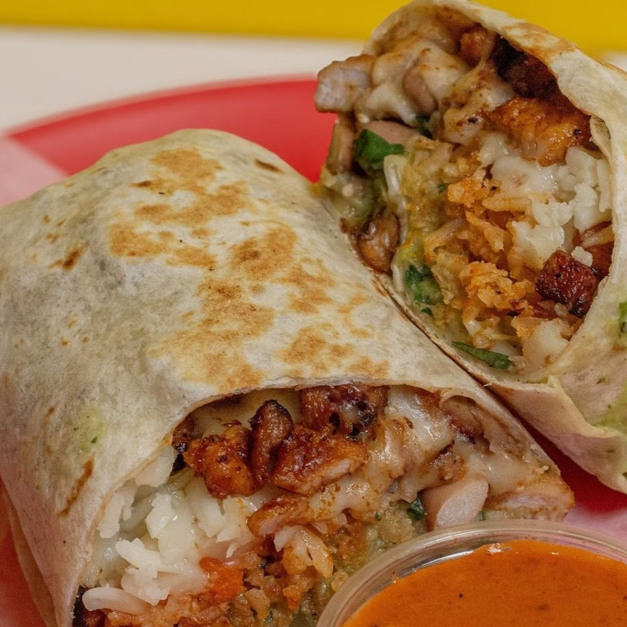 Dos deliciosos burritos en tortilla de harina normal cada uno con queso y carne al pastor