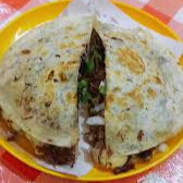 Deliciosa carne de suadero envuelta en queso servida sobre tortilla de harina de tamaño estándar.