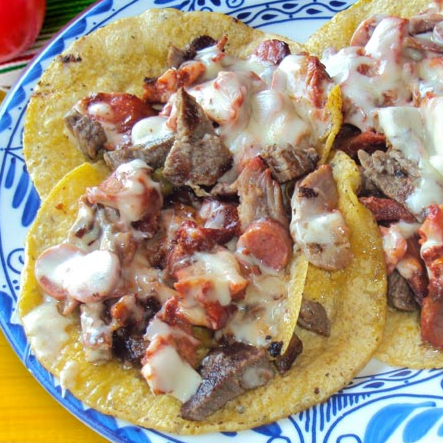 Delicioso taco de suadero con longaniza en tortilla taquera del número 10.