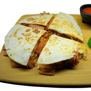 Deliciosa carne al pastor envuelta en queso servida sobre tortilla de harina de tamaño estándar.