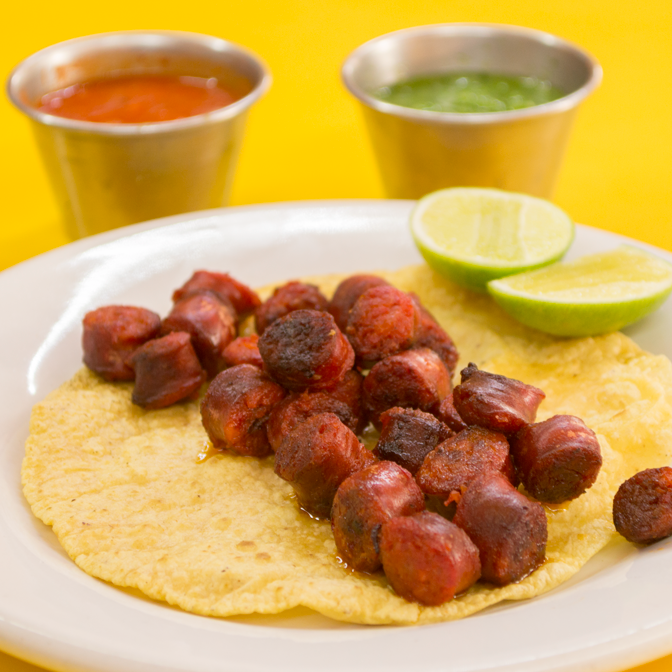 2 TORTILLAS DE MAIZ CON CHISTORRA, CEBOLLAS Y NOPALES.