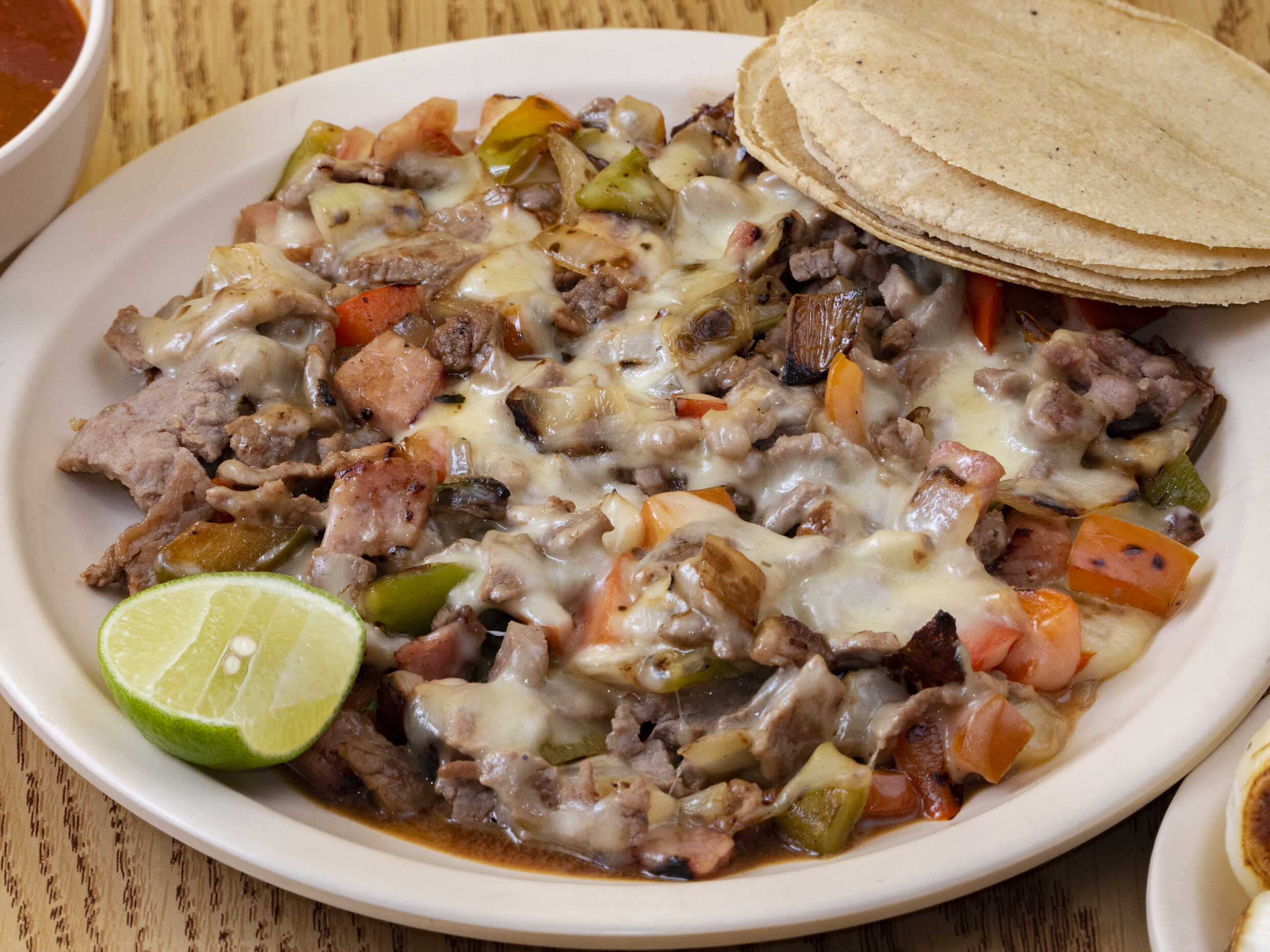 Morrón, cebolla, jitomate, tocino, jamón, bistec y queso.