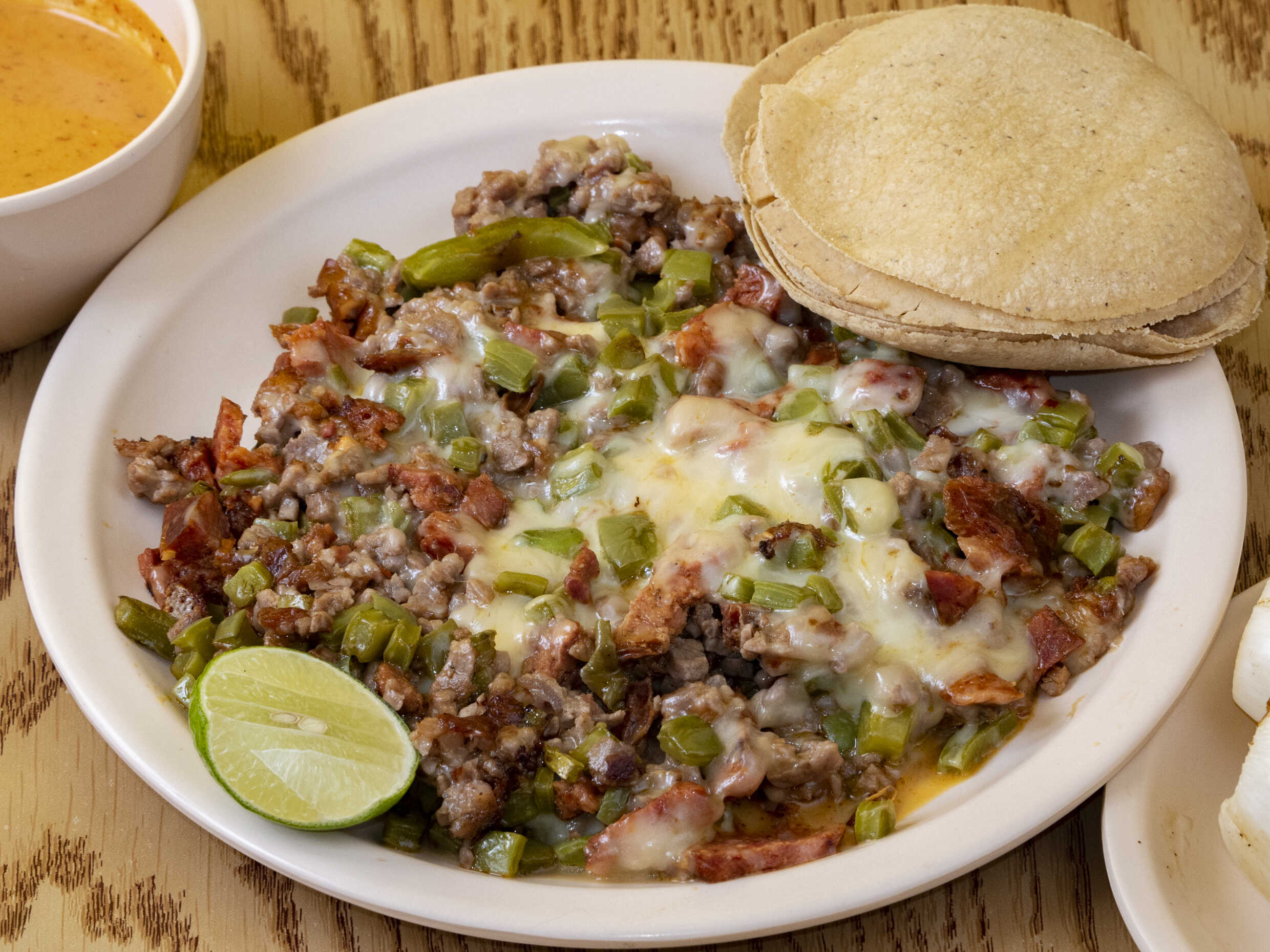 Platillo personal, el cual incluye carne de pastor ( 150 gramos)con queso ( 50 gramos)manchego, salsas por aparte ( verde, roja y cacahuate)