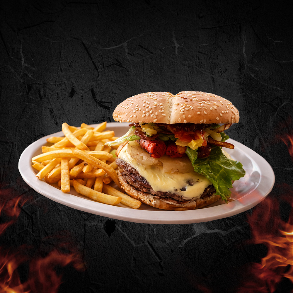 Dos carnes de sirlon molida y asada al carbón, gratinada con 3 quesos, piña, chorizo, lechuga, jitomate, cebolla sazonada, salsa de mostaza, chimichurri, cátsup y mayonesa y papas a la francesa