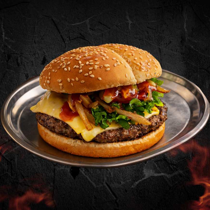 Carne de sirlon molida y asada al carbón, gratinada con queso gouda, lechuga, jitomate, cebolla sazonada, salsa de mostaza, chimichurri, cátsup y mayonesa