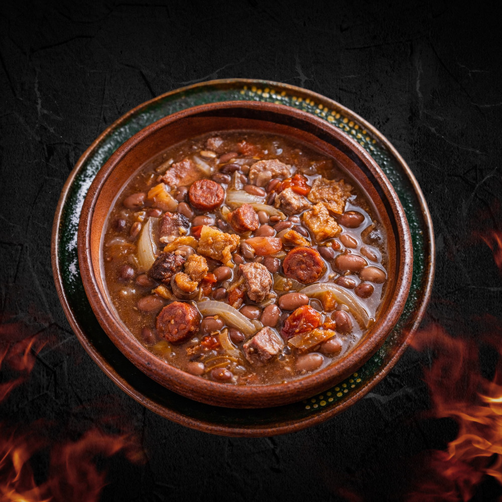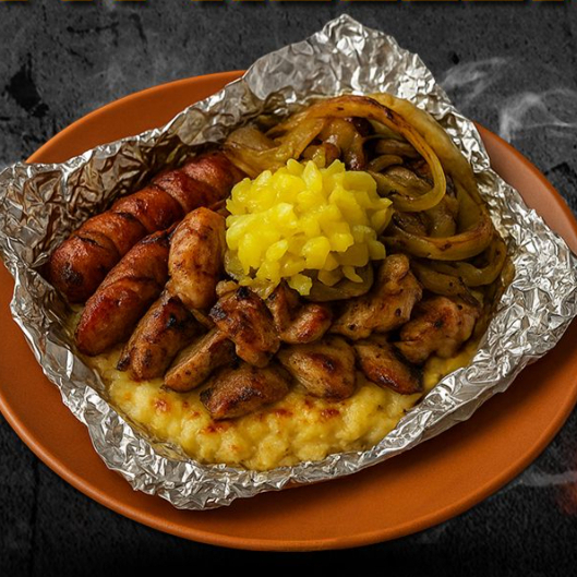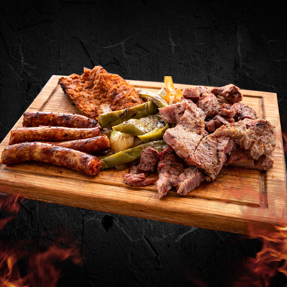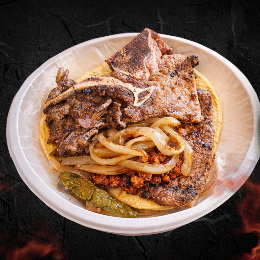 Porción de arrachera, ribeye, chorizo ahumado, chistorra y panceta, dos papas rellenas, nopal, cebolla, chiles toreados y tortillas (1kg de producto)