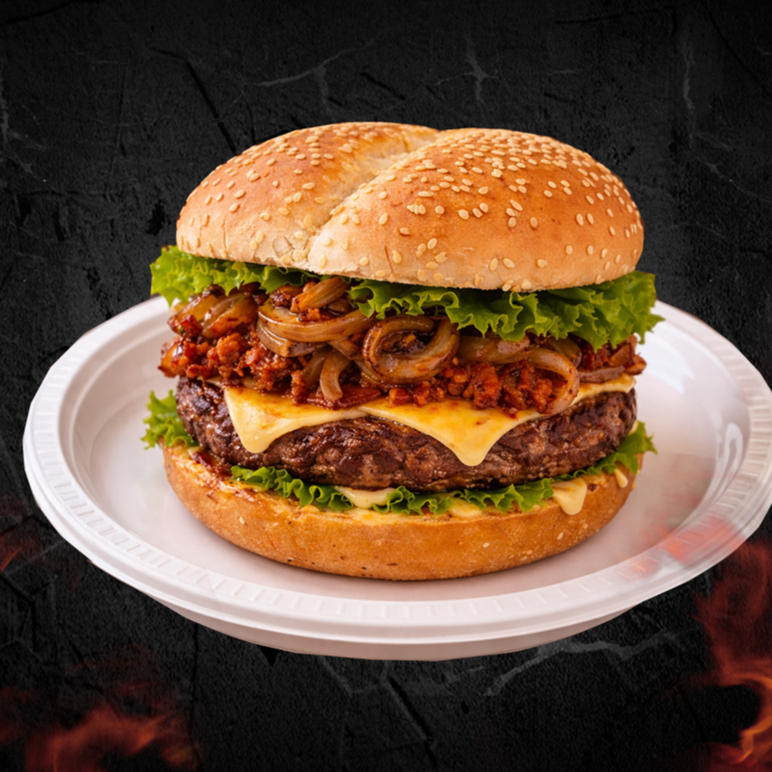 Carne de sirlon molida y asada al carbón, gratinada con queso gouda y chorizo, lechuga, jitomate, cebolla sazonada, salsa de mostaza, chimichurri, cátsup y mayonesa
