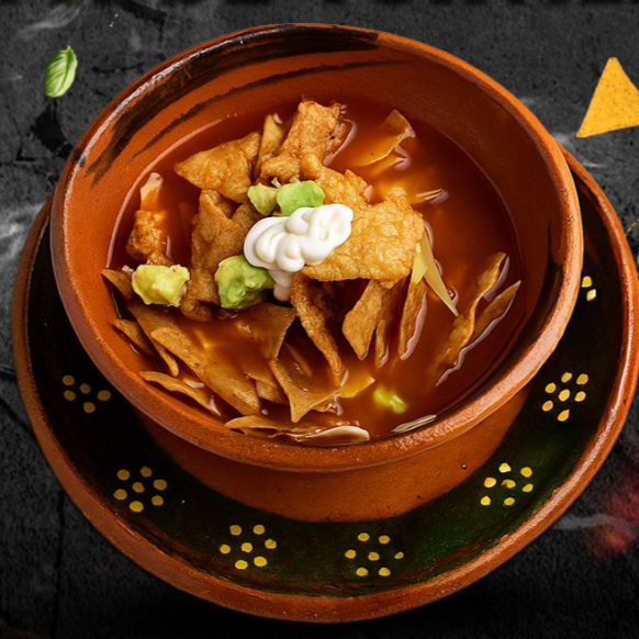 Sopa de Tortilla con crema, queso gouda, aguacate y chicarron