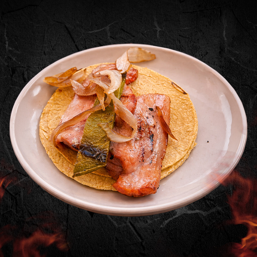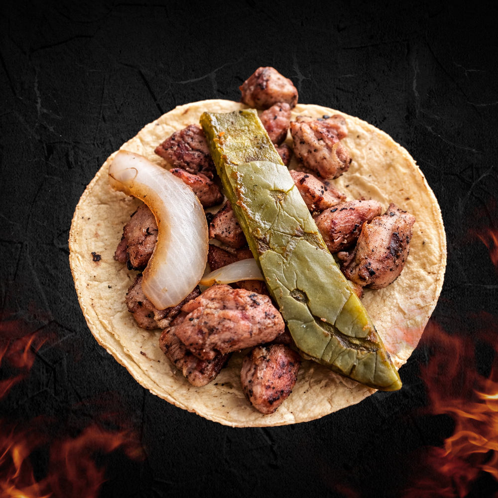 Bistec marinado al carbón en dos tortillas de maíz con nopal y cebolla