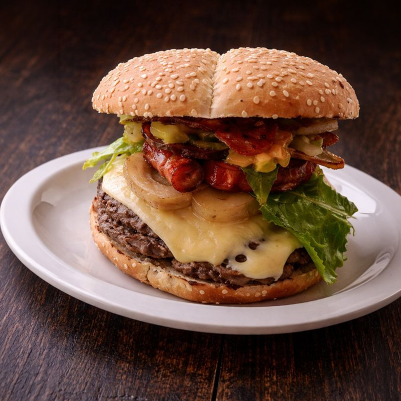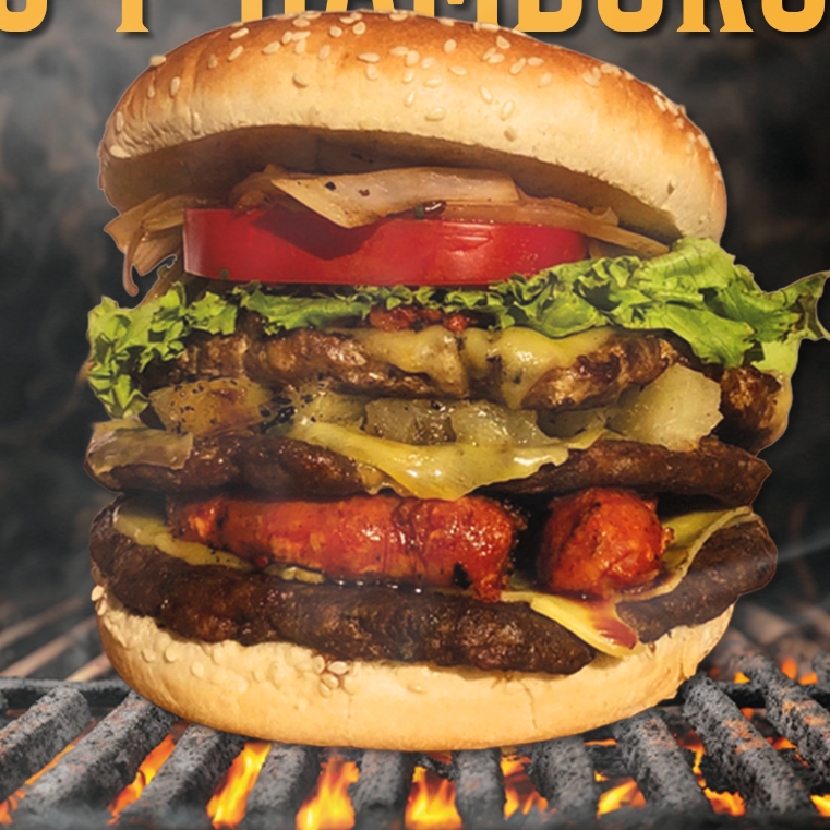 Dos carnes de sirlon molida y asada al carbón, gratinada con queso gouda y chorizo, lechuga, jitomate, cebolla sazonada, salsa de mostaza, chimichurri, cátsup y mayonesa