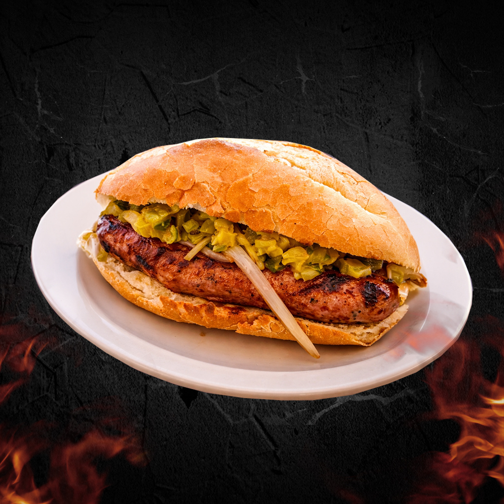 Chorizo argentino asado al carbón entre un bolillo caliente, servido con chimichurri, cebolla sazonada y salsa de mostaza