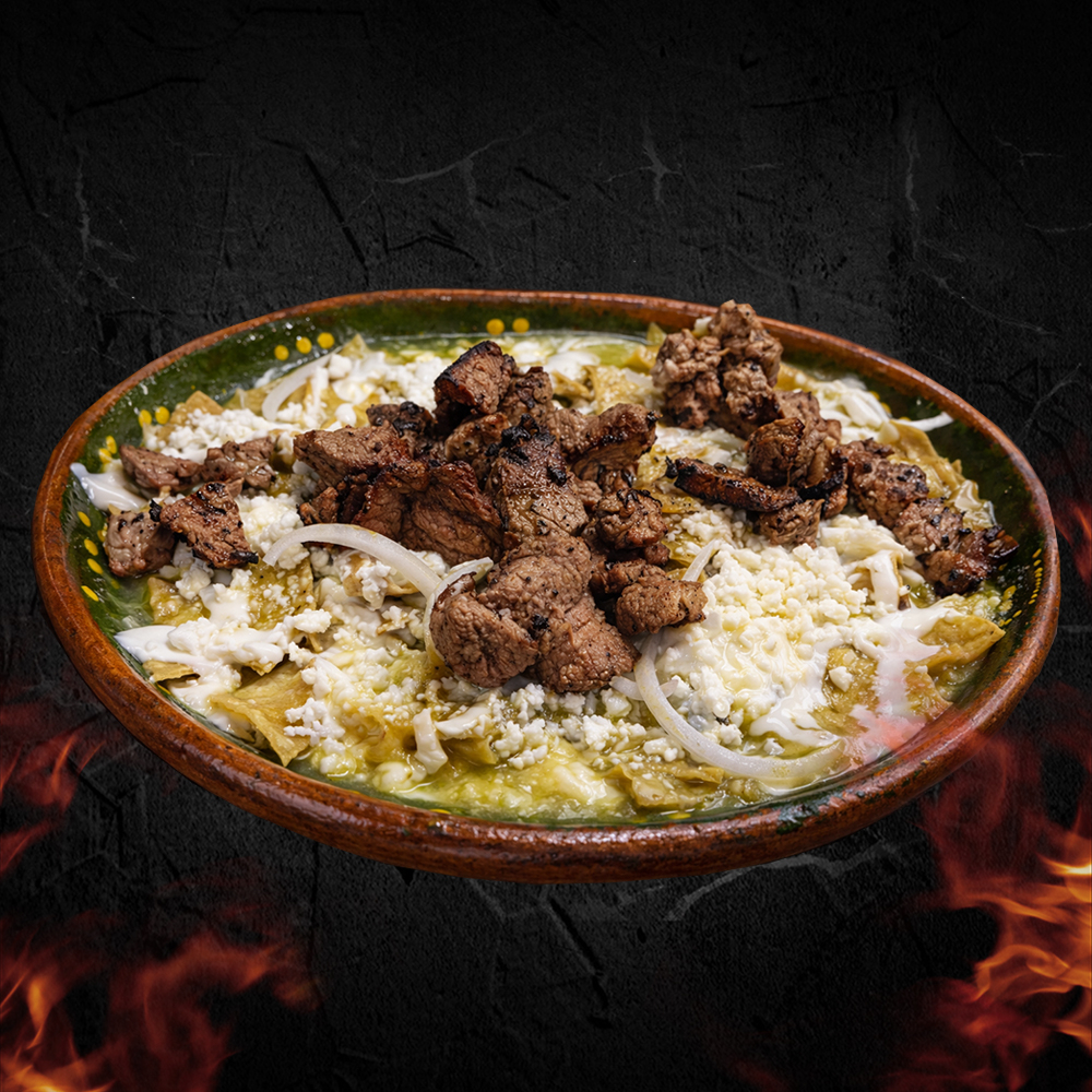 Chilaquiles verdes, acompañados con queso, crema, cebolla y porción de arrachera asada al carbón