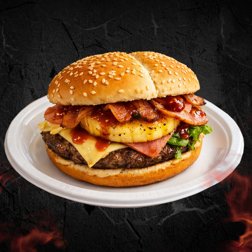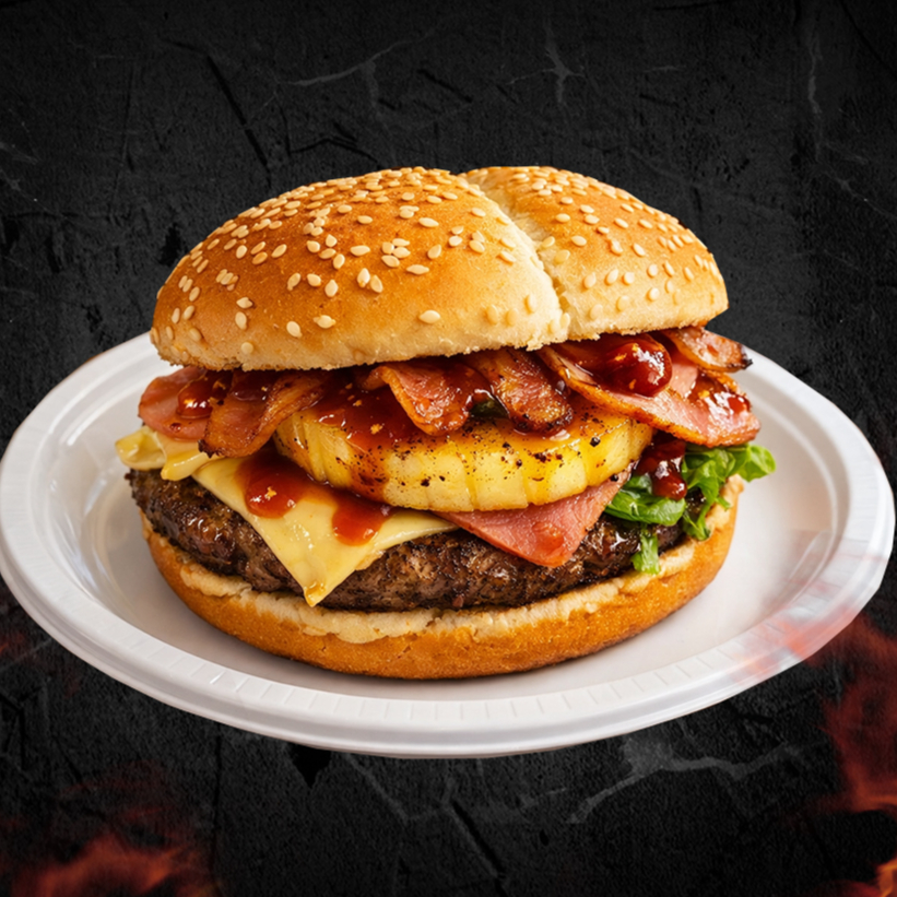 Carne de sirlon molida y asada al carbón, gratinada con queso gouda, piña, lechuga, jitomate, cebolla sazonada, salsa de mostaza, chimichurri, cátsup y mayonesa