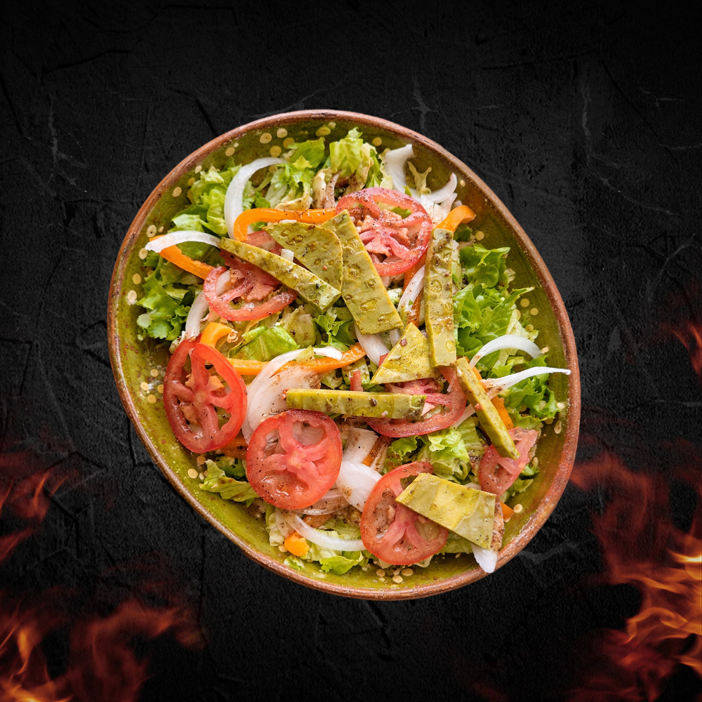 Ensalada de lechuga, jitomate, pimiento, cebolla, adrezo y porción de arrachera asada al carbón