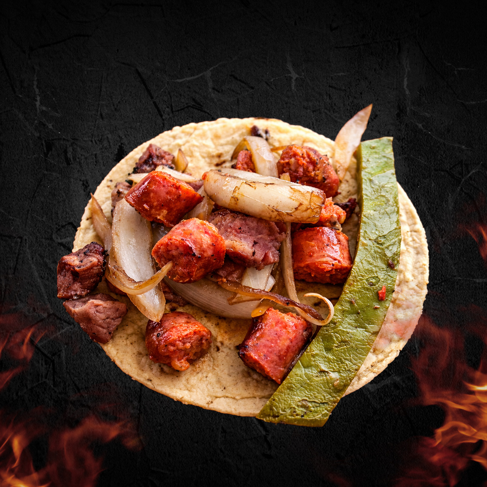 Alambre de arrachera, chorizo ahumado, tocino, pimientos, cebolla y mix de quesos. Se entrega con tortillas