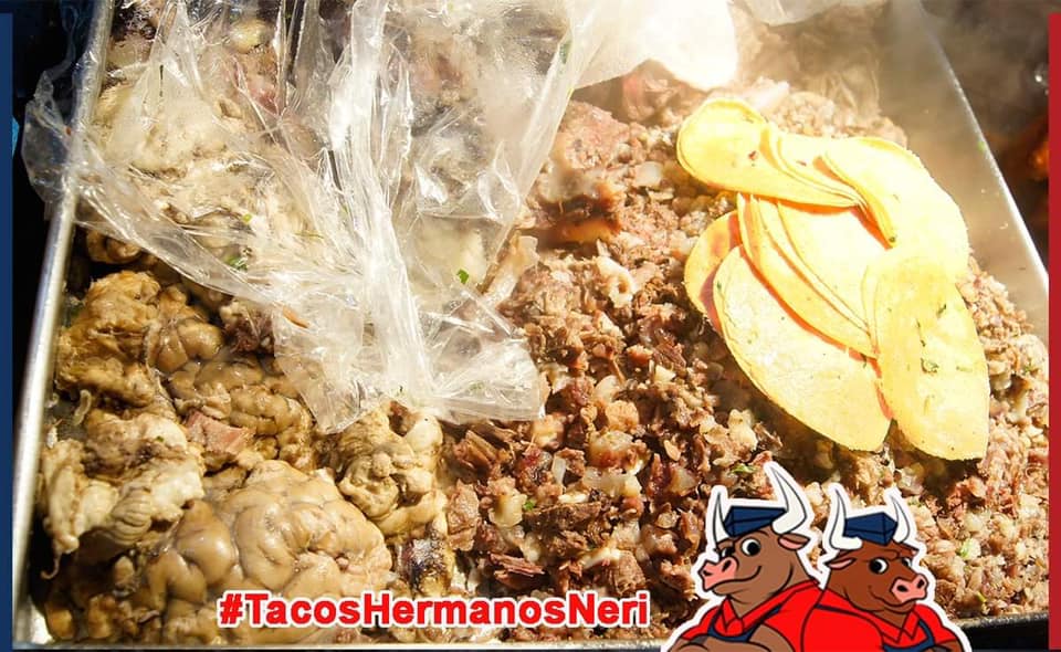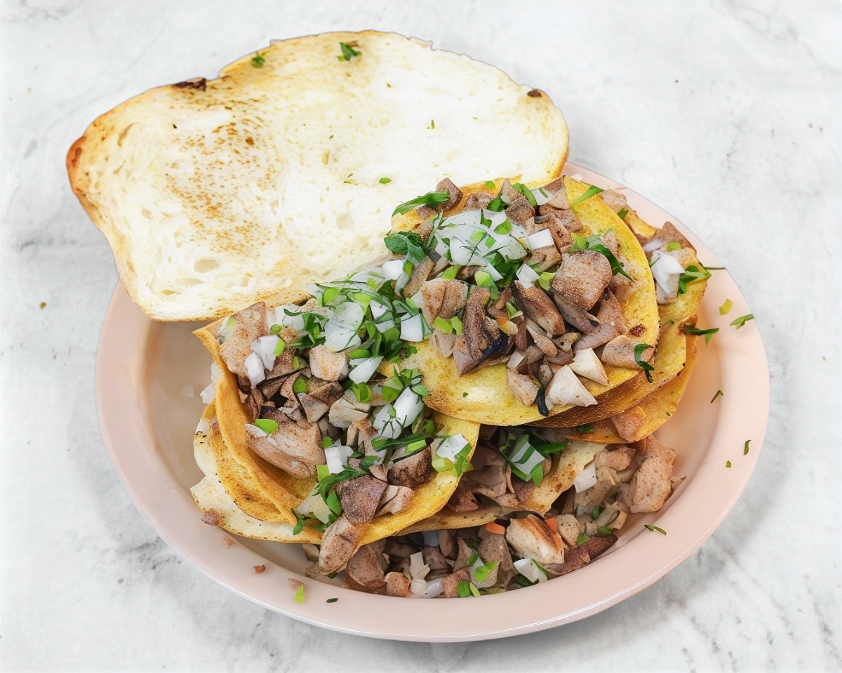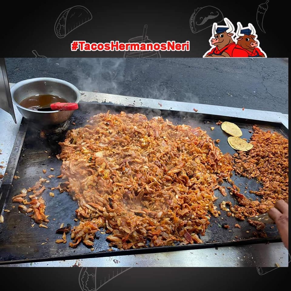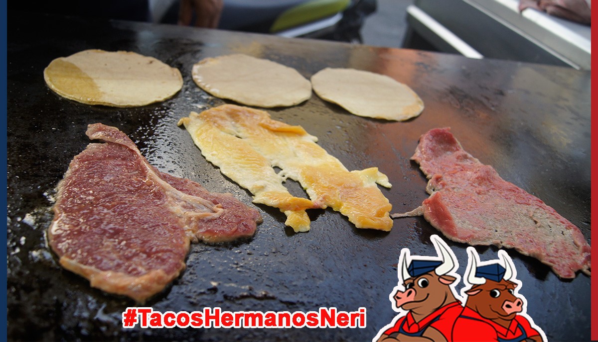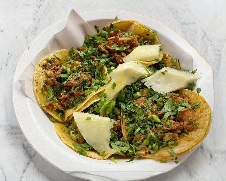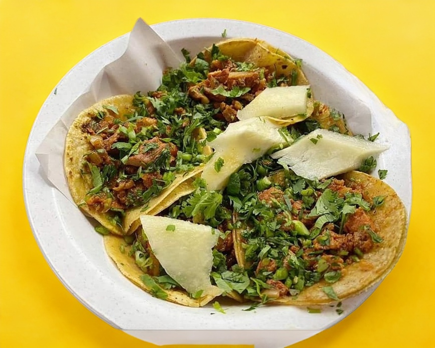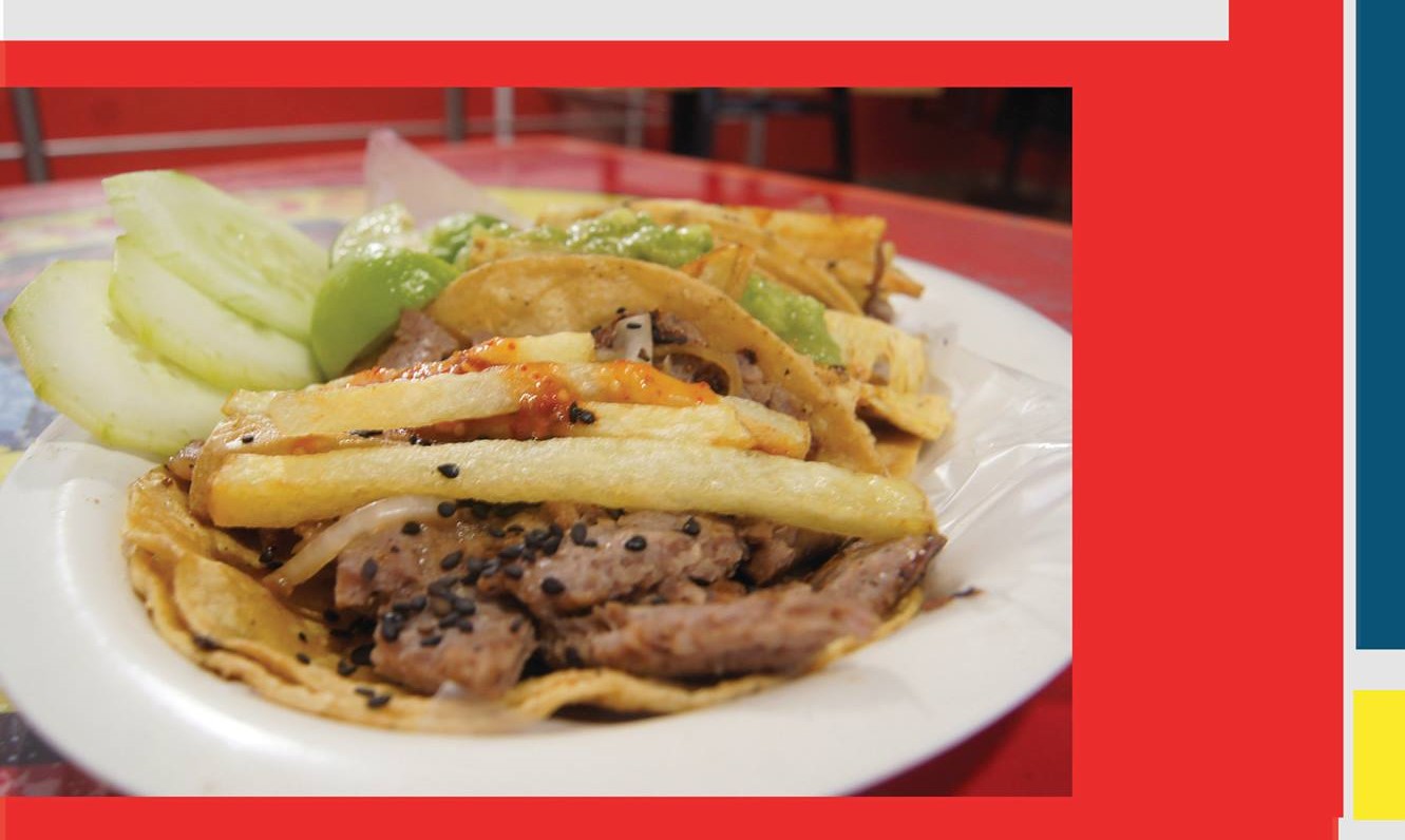 Tortilla de maíz, carne, papa y cebolla rallada.