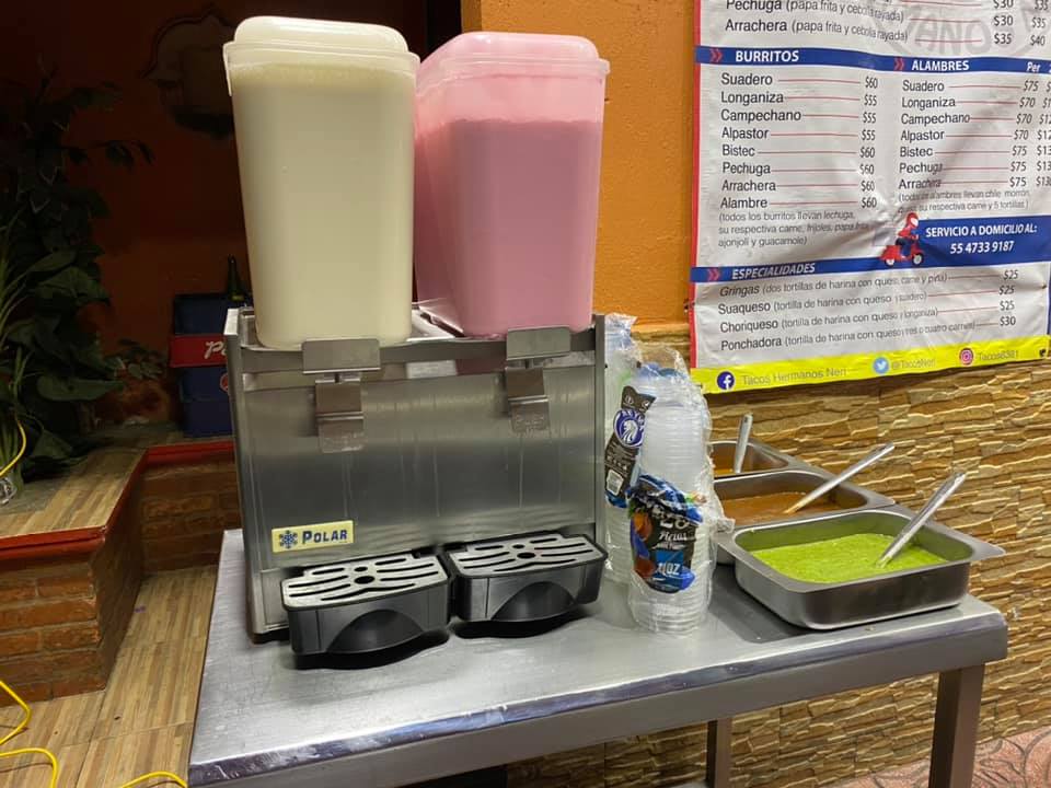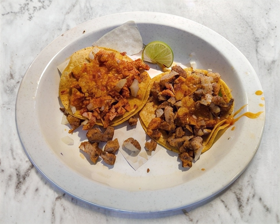 1 Taco con doble tortilla de maíz, acompañado con carne suadero, cebolla, cilantro, limones y salsa roja.
