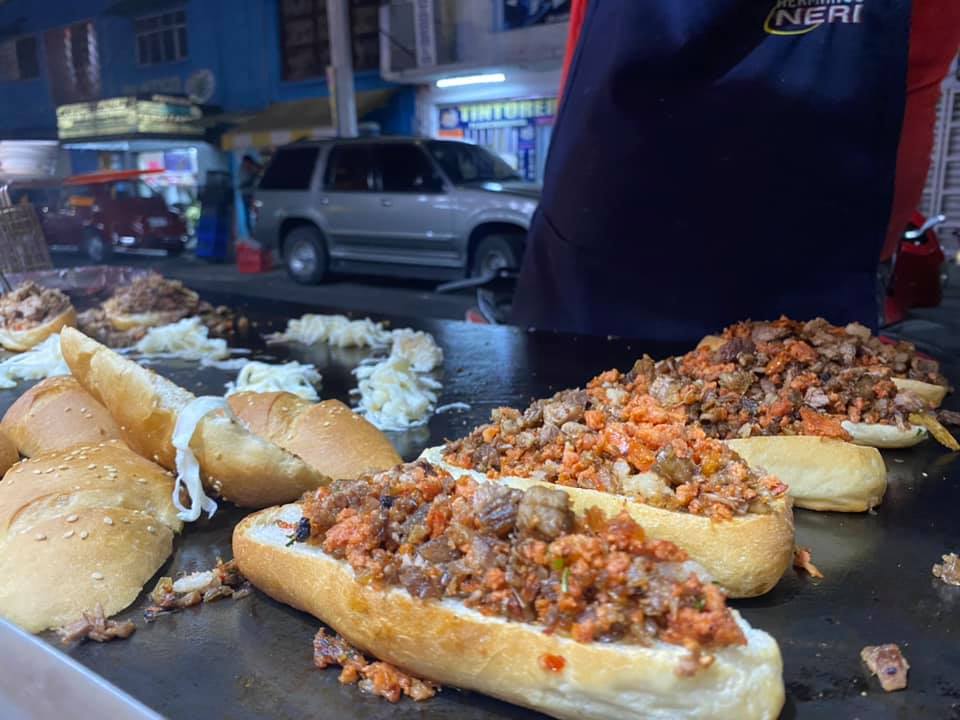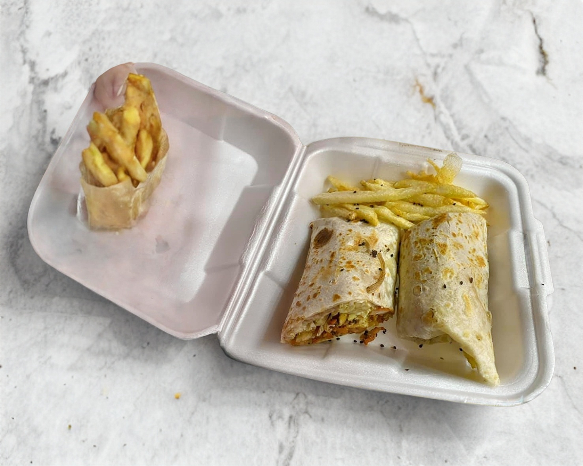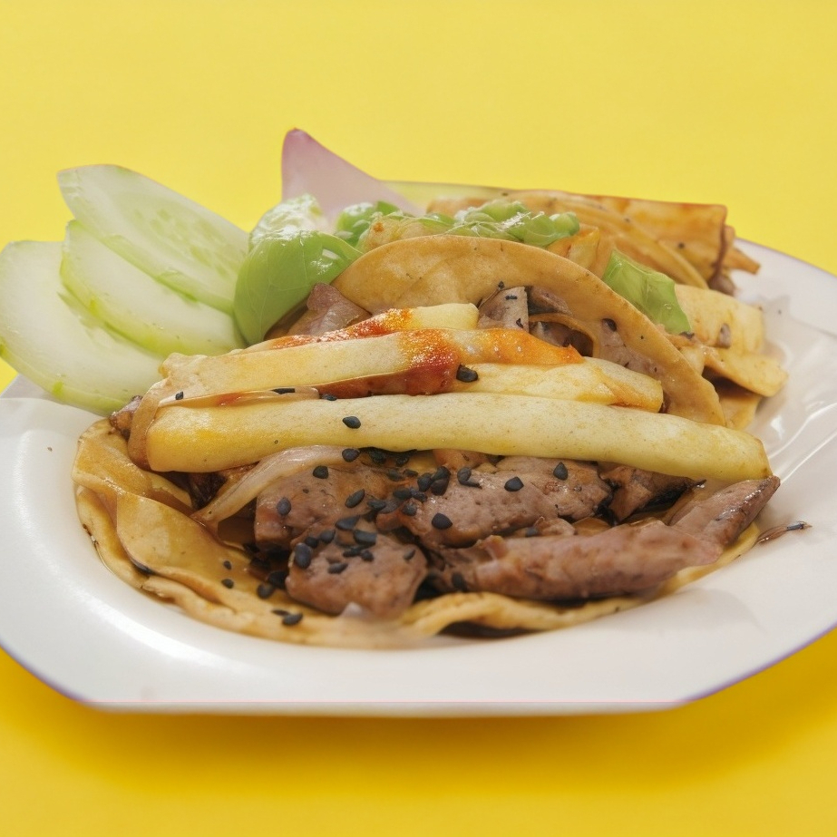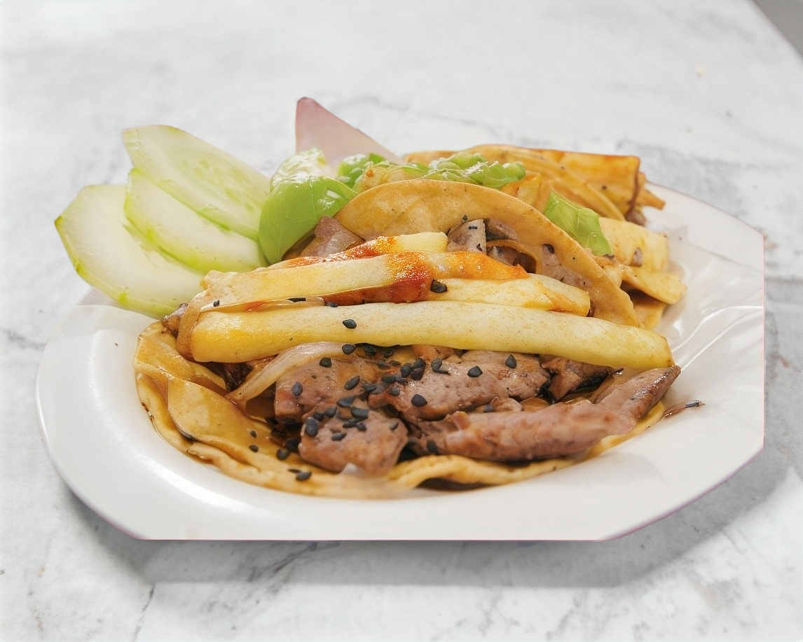Tortilla de harina con tres carnes a elegir, cebolla rallada, queso fundido y papa frito.
