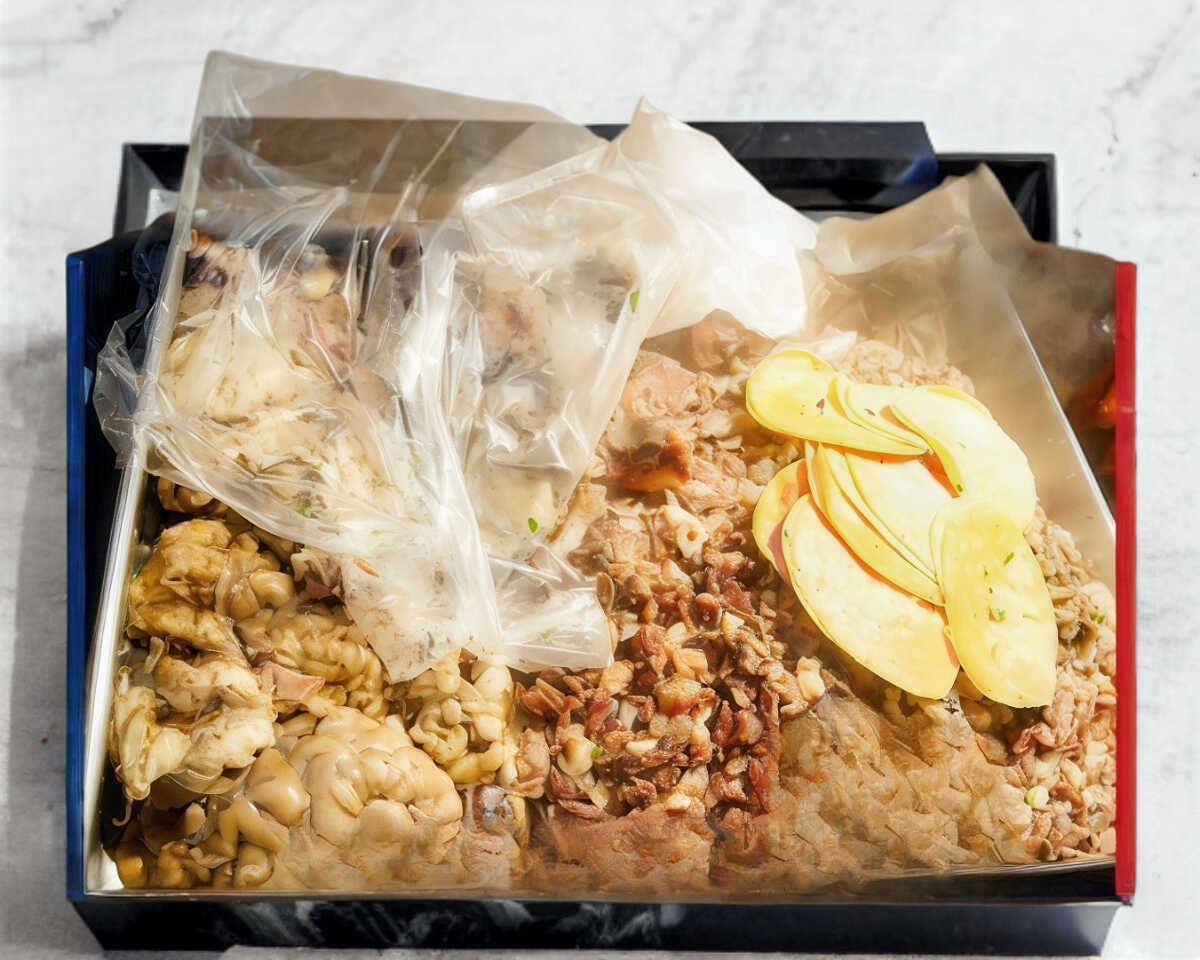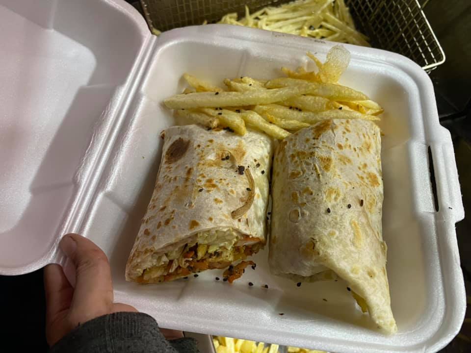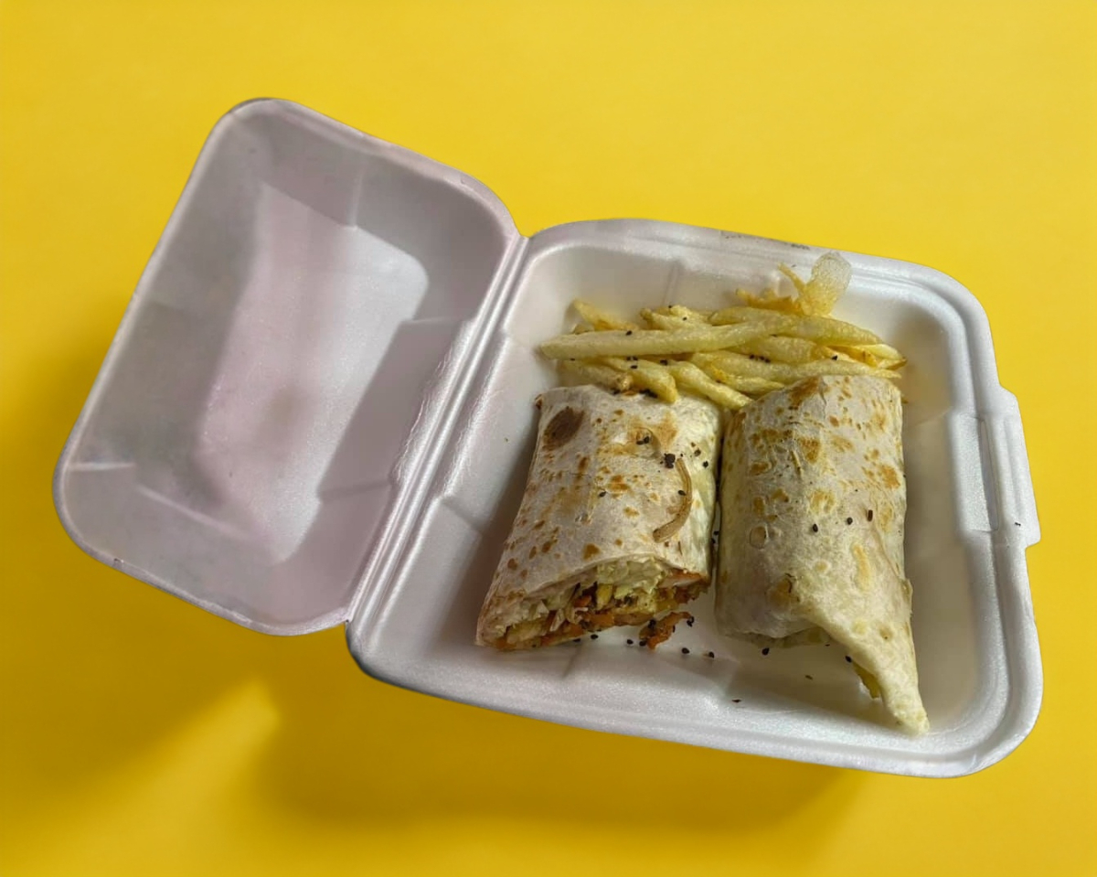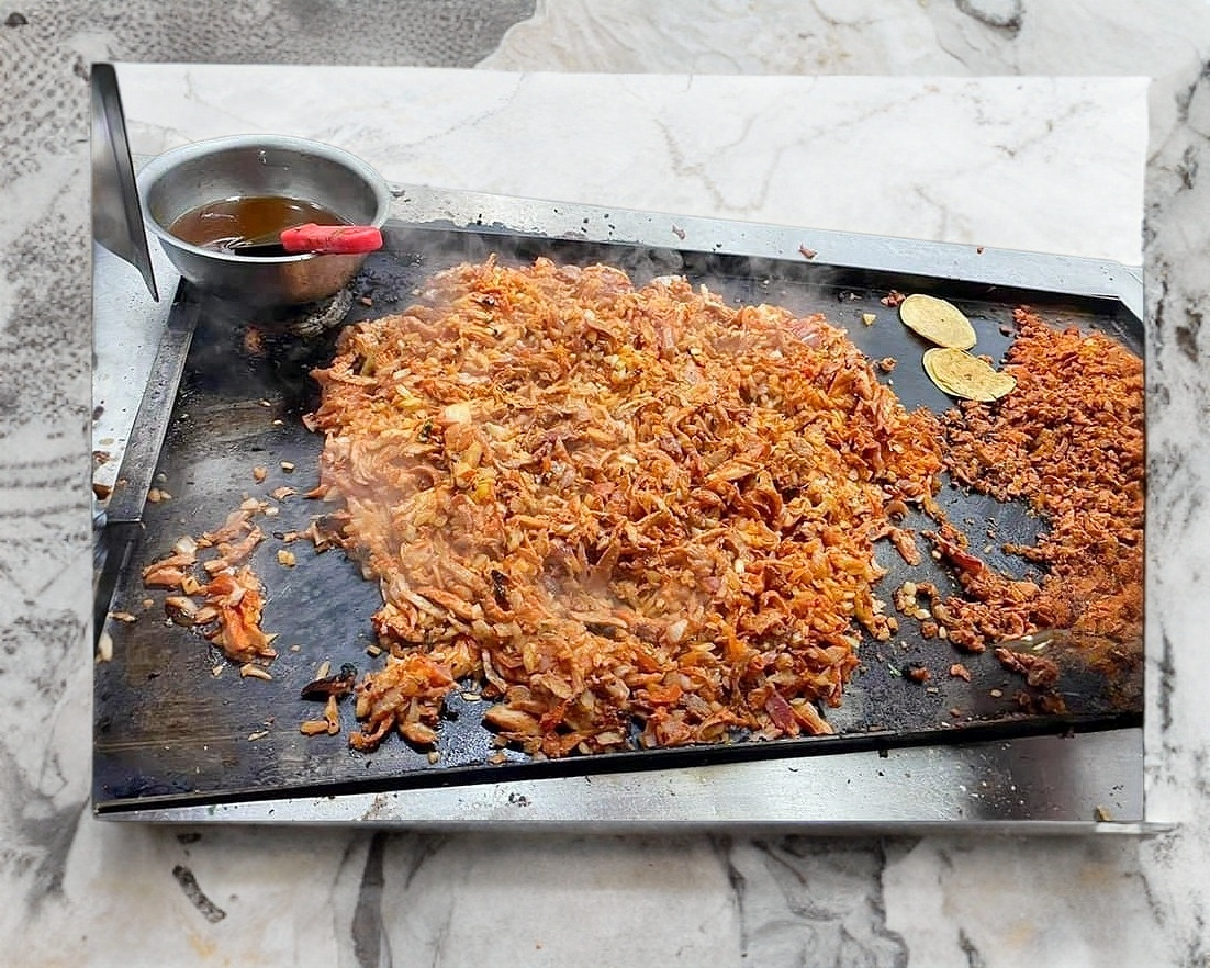 Tortilla de harina con tres carnes a elegir, cebolla rallada, queso fundido y papa frito.