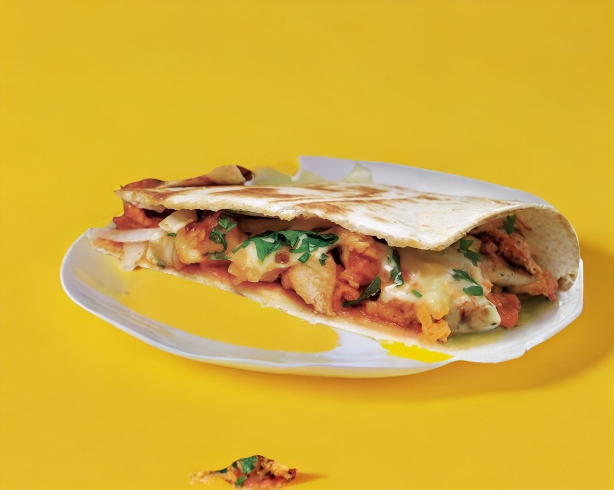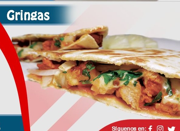 2 Tortillas de harina, queso fundido, carne, cebolla y cilantro.
