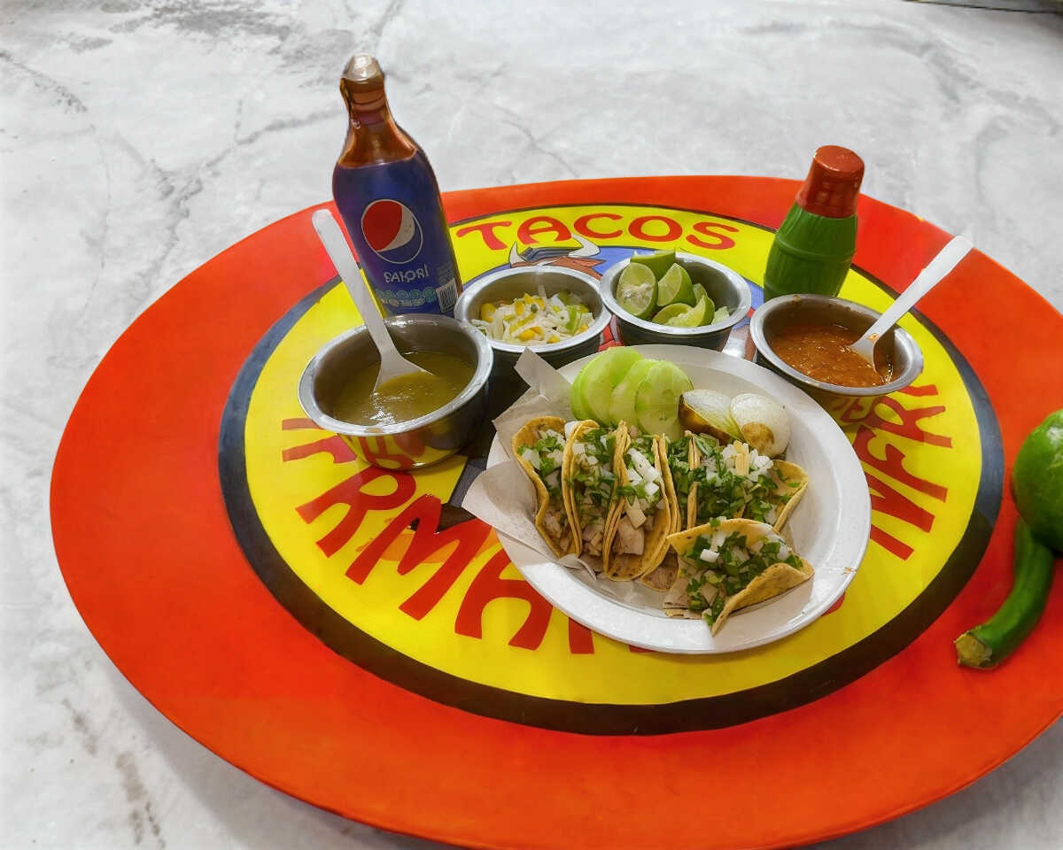 1 Taco con doble tortilla de maíz, acompañado de carne de pastor, cebolla, cilantro, limones y salsa.