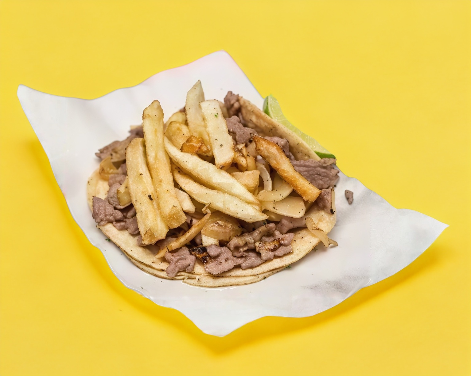 1 Taco de Pastor, acompañado con 200 gr papas francesa y puede escoger hasta 3 complementos ( pepinos con rábanos, pico de gallo, chicharrón, cebolla con habanero, etc) , incluye limones