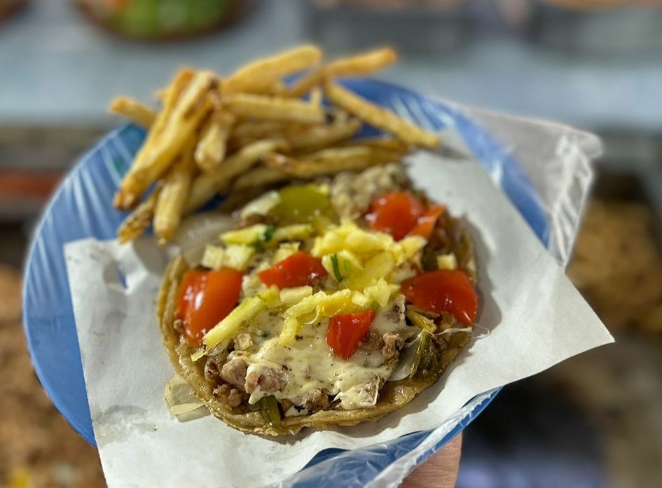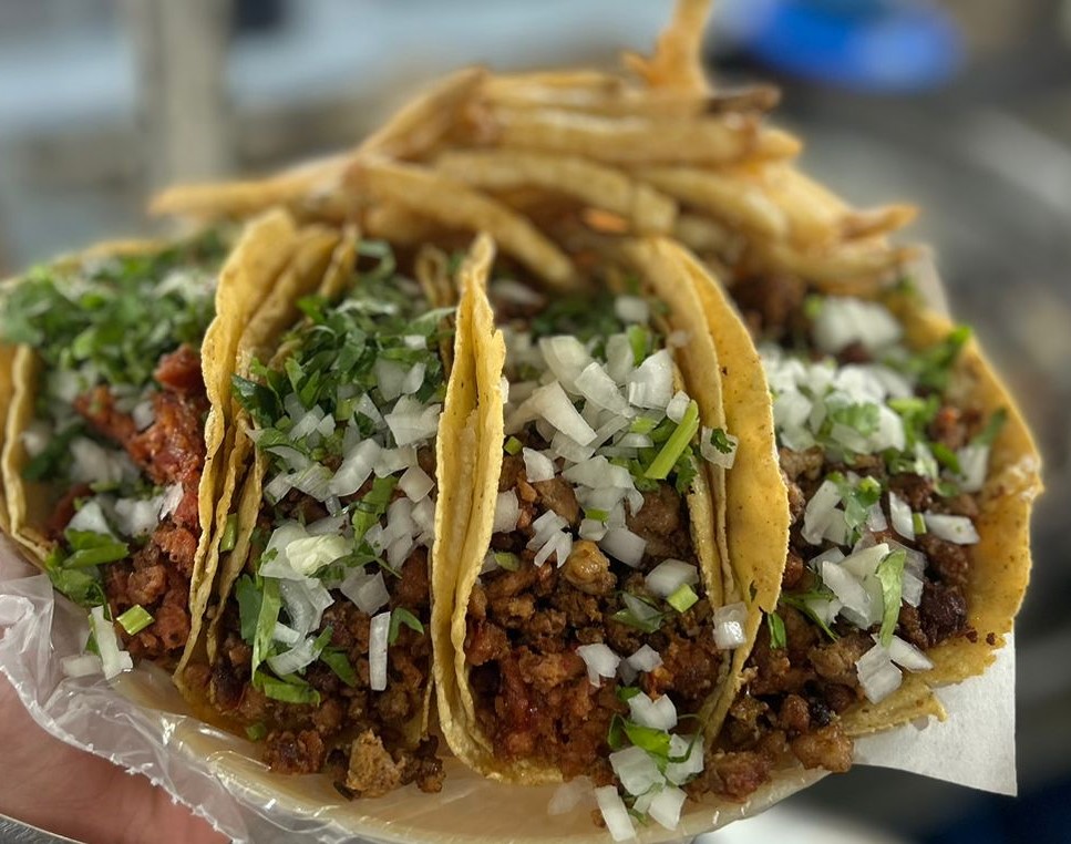 1 taco de longaniza. Incluye porción de papas fritas (aprox. 200 g) e incluye 3 complementos a elección (pepinos con rábanos, pico de gallo, chicharrón, cebolla con habanero, etc.); incluye salsa y limones.
